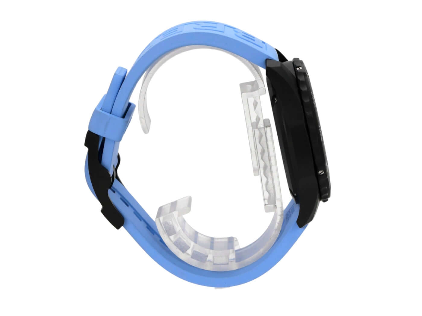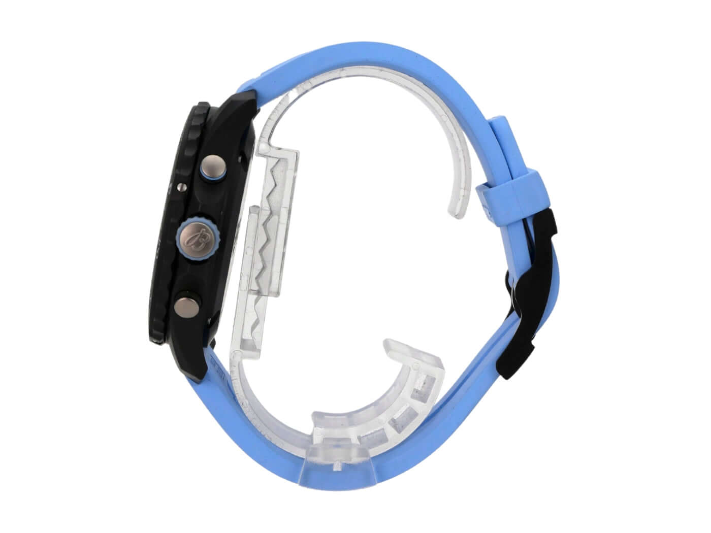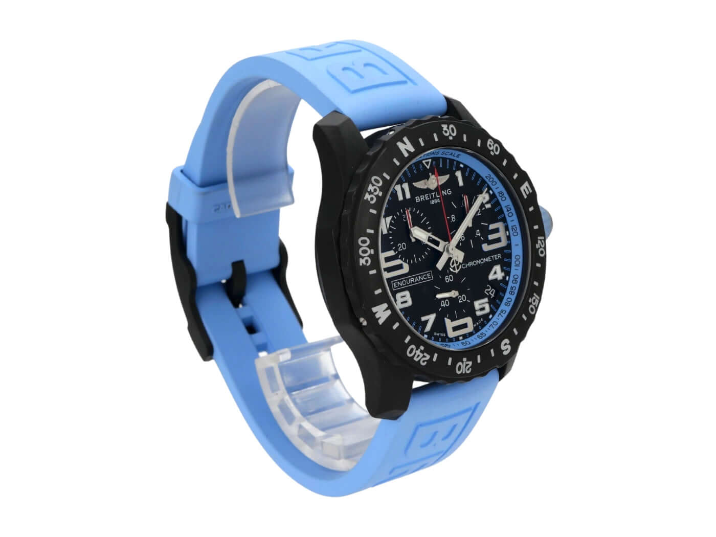 Gehäuse aus Breitlight, Gehäusedurchmesser 44 mm, Gehäusehöhe 12,5 mm, Breitlight Lünette beidseitig drehbar, blaues Kautschukband mit Dornschließe, schwarzes Zifferblatt mit aufgesetzten Leuchtziffern und Leuchtzeiger, Quarzwerk, Breitling 82, Datumsanzeige, Chronograph, Chronometer, Saphirglas doppelseitig entspiegelt, Breitlight Boden, wasserdicht bis zu 10 bar.