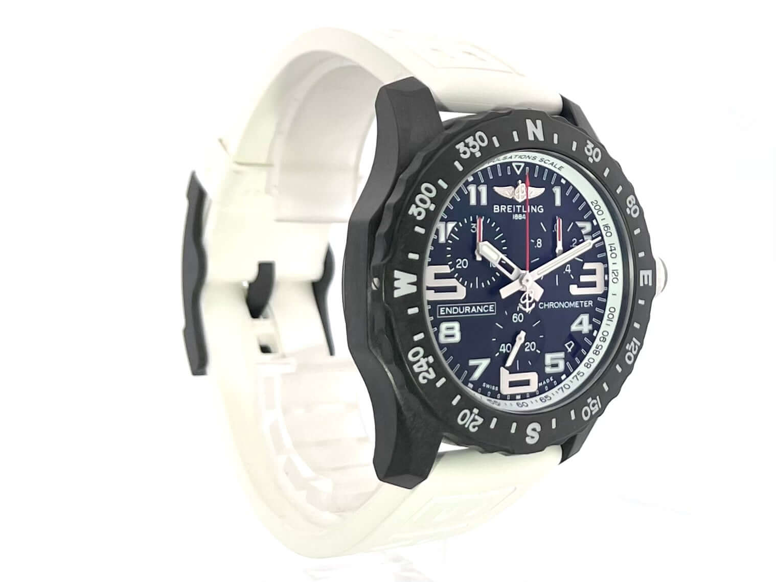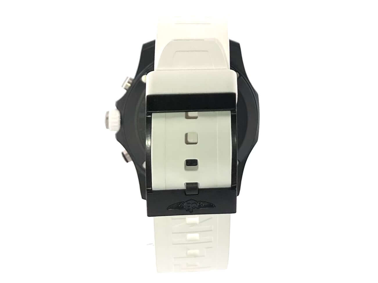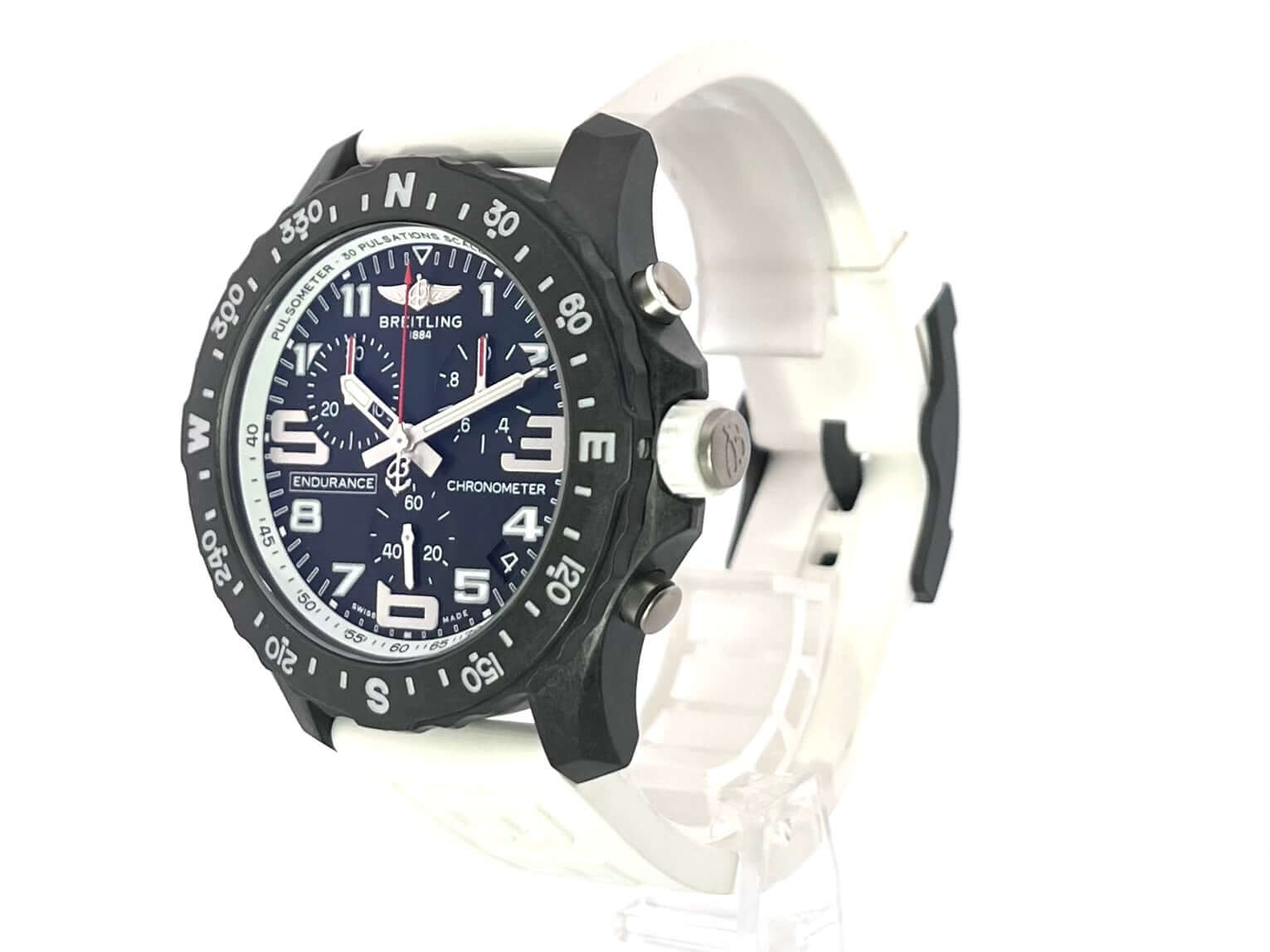 Gehäuse aus Breitlight, Gehäusedurchmesser 44 mm, Gehäusehöhe 12,5 mm, Breitlight Lünette beidseitig drehbar, weißes Kautschukband mit Dornschließe, schwarzes Zifferblatt mit aufgesetzten Leuchtziffern und Leuchtzeiger, Quarzwerk, Breitling 82, Datumsanzeige, Chronograph, Chronometer, Saphirglas doppelseitig entspiegelt, Breitlight Boden, Wasserdicht bis zu 10 bar.