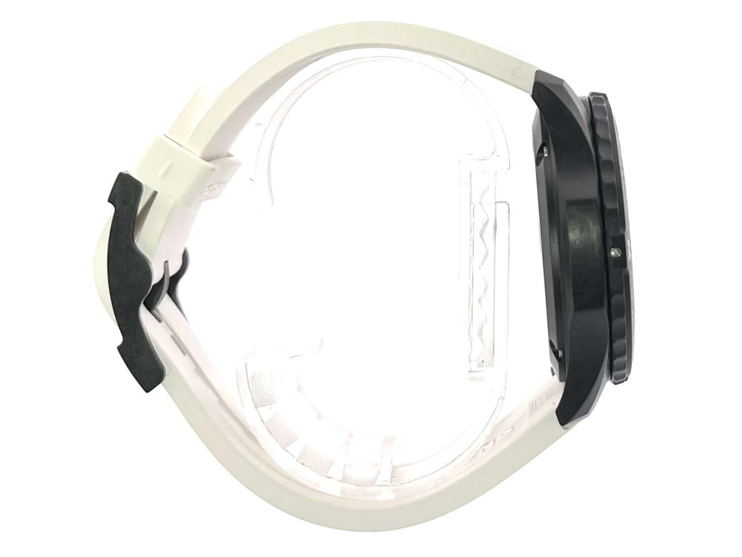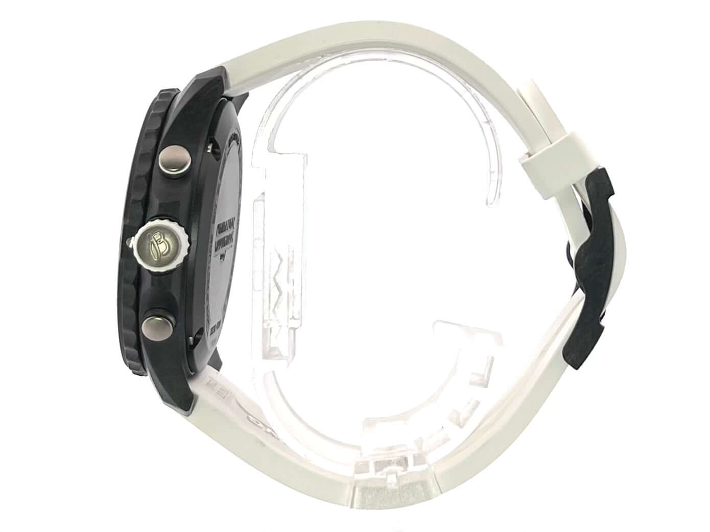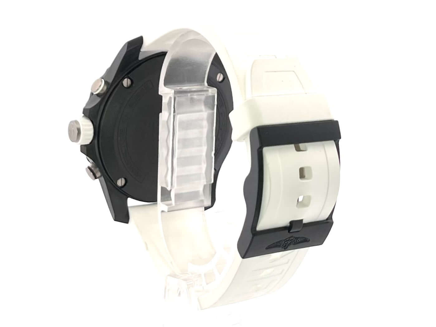 Gehäuse aus Breitlight, Gehäusedurchmesser 44 mm, Gehäusehöhe 12,5 mm, Breitlight Lünette beidseitig drehbar, weißes Kautschukband mit Dornschließe, schwarzes Zifferblatt mit aufgesetzten Leuchtziffern und Leuchtzeiger, Quarzwerk, Breitling 82, Datumsanzeige, Chronograph, Chronometer, Saphirglas doppelseitig entspiegelt, Breitlight Boden, Wasserdicht bis zu 10 bar.