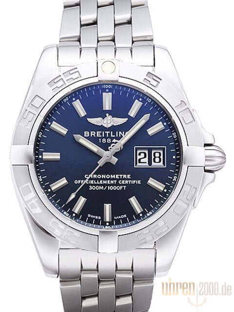 Gehäuse aus Edelstahl poliert, Gehäusedurchmesser 41 mm, Gehäusehöhe 14 mm, Lünette aus Edelstahl mit 60 Minuten Skala, einseitig drehbar mit Sperre, Pilot Armband aus Edelstahl poliert mit Faltschließe, blaues Zifferblatt mit aufgesetzten Leuchtindexen, Leuchtzeiger, Sekundenzeiger mit Leuchtspitze, Zentralsekunde, Automatik Uhrwerk, Kaliber Breitling 49, 25 Steine, 28.800 A/h, Gangreserve ca. 42 Stunden, Datum, Chronometer mit Zeugnis, Saphirglas, Krone verschraubbar mit Flankenschutz, 2 Dichtungen, Edelstahlboden verschraubt, Wasserdicht bis zu 30 bar.