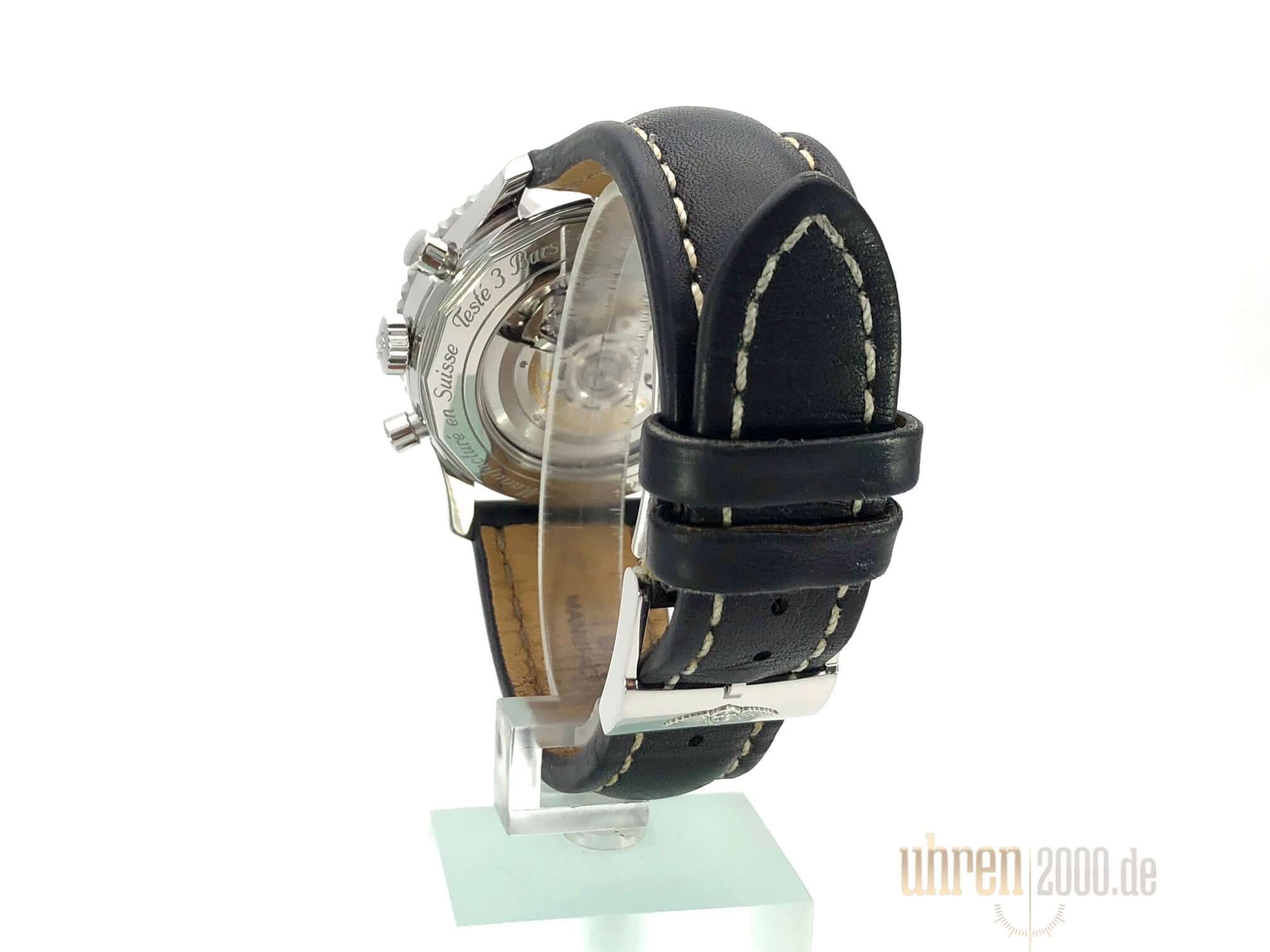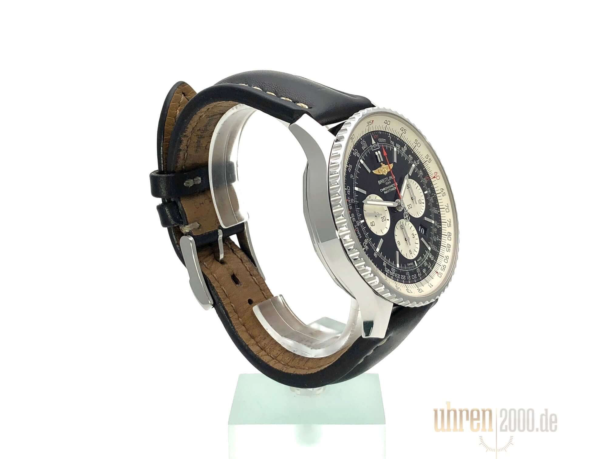 Gehäuse aus Edelstahl poliert, Gehäusedurchmesser 46 mm, Gehäusehöhe 14,5 mm, Edelstahl Lünette gerädelt mit Rechenschieber und beidseitig drehbar, Lederarmband schwarz mit weißer Ziernaht und Dornschließe, Anstoßbreite 22mm, schwarzes Zifferblatt mit aufgesetzten Leuchtziffern, Totalisatoren silberfarben, Leuchtzeiger, Automatikwerk, Chronometer mit Zeugnis, Manufakturkaliber Breitling 01 mit 47 Steine, Schwingung 28.800 A/h, Gangreserve für ca. 70 Stunden, Datumsanzeige, Saphirglas doppelseitig entspiegelt, Boden aus Edelstahl verschraubt und graviert mit Sichtfenster, Wasserdicht bis zu 3 bar.