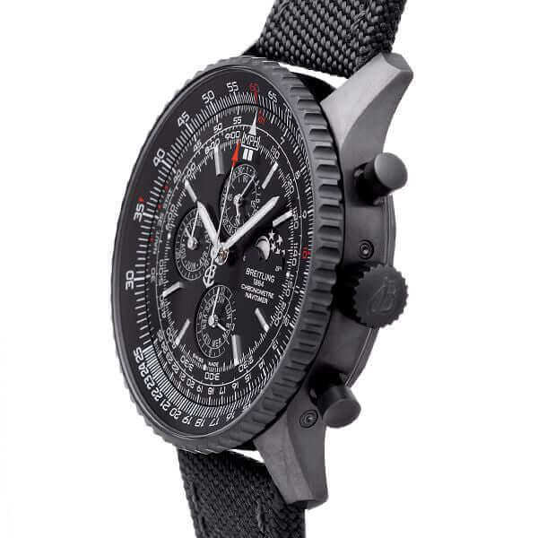 Gehäuse aus schwarz beschichtetem Edelstahl, Gehäusedurchmesser 48 mm, Gehäusehöhe 15,65 mm, Lünette aus schwarz beschichtetem Edelstahl, Military Anthrazit mit Dornschließe, schwarzes Zifferblatt mit aufgesetzten Indexen, Leuchtpunkte, Edelstahl Leuchtzeiger, Automatikwerk, Chronograph, Breitling 19 mit 38 Steine, Schwingung 28.800 A/h, Gangreserve für ca. 42 Stunden, Schaltjahr Kalender, Zeigeranzeige (Datum, Wochentag, Monat, Mondphasen), Saphirglas, doppelseitig entspiegelt, Boden aus schwarz beschichtetem Edelstahl verschraubt und graviert, Wasserdicht bis zu 3 bar, Limitiert auf 1000 Stück.