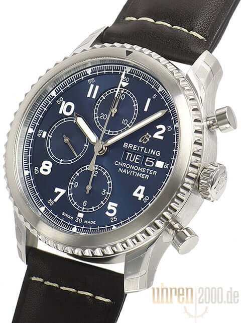 Gehäuse aus Edelstahl poliert und satiniert, Gehäusedurchmesser 43 mm, Gehäusehöhe 14,17 mm, Edelstahl Lünette gerädelt, schwarzes Lederband mit Dornschließe, blaues Zifferblatt mit aufgesetzten arabischen Ziffern, Leuchtzeiger, Automatikwerk, Breitling 13 mit 25 Steine, 28.800 A/h, Gangreserve ca. 42 Stunden, Datumsanzeige, Wochentag, Chronometer, bombiertes Saphirglas doppelseitig entspiegelt, Edelstahlboden verschraubt, Wasserdicht bis zu 10 bar.