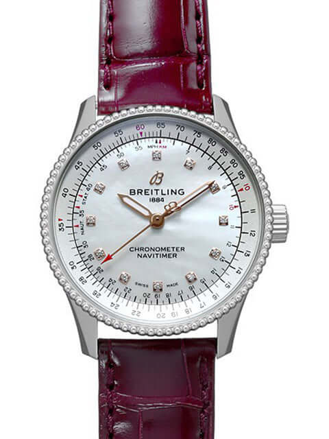 Gehäuse aus Edelstahl poliert, Gehäusedurchmesser 35 mm, Gehäusehöhe 9,92 mm, drehbare Edelstahl Lünette mit Rechenschieber, rotes Krokolederband mit Dornschließe, Perlmutt Zifferblatt mit aufgesetzten Diamanten, Leuchtzeiger, Automatik, Kaliber Breitling 17, 25 Steine, 28.800 A/h, Gangreserve ca. 40 Stunden, Datum, Chronometer, Zentralsekunde, Saphirglas, Edelstahlboden verschraubt, Wasserdicht bis zu 3 bar.