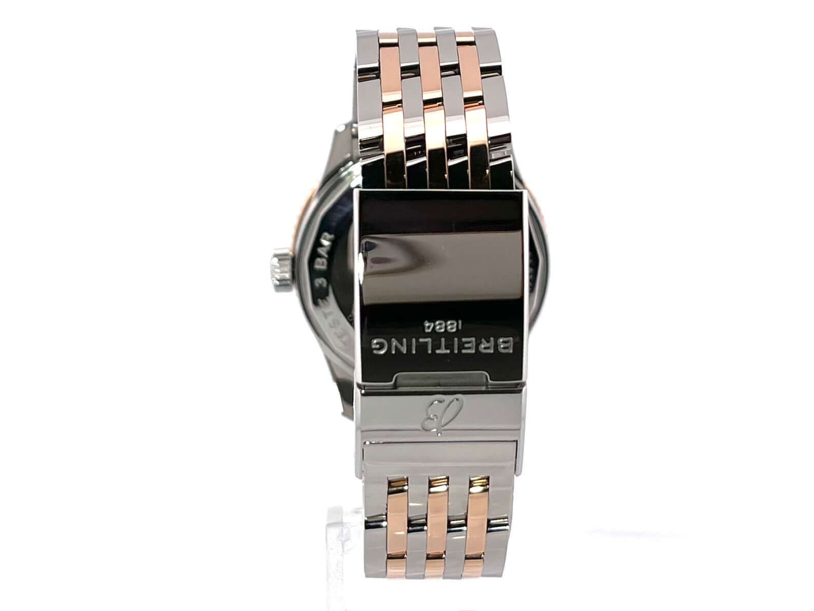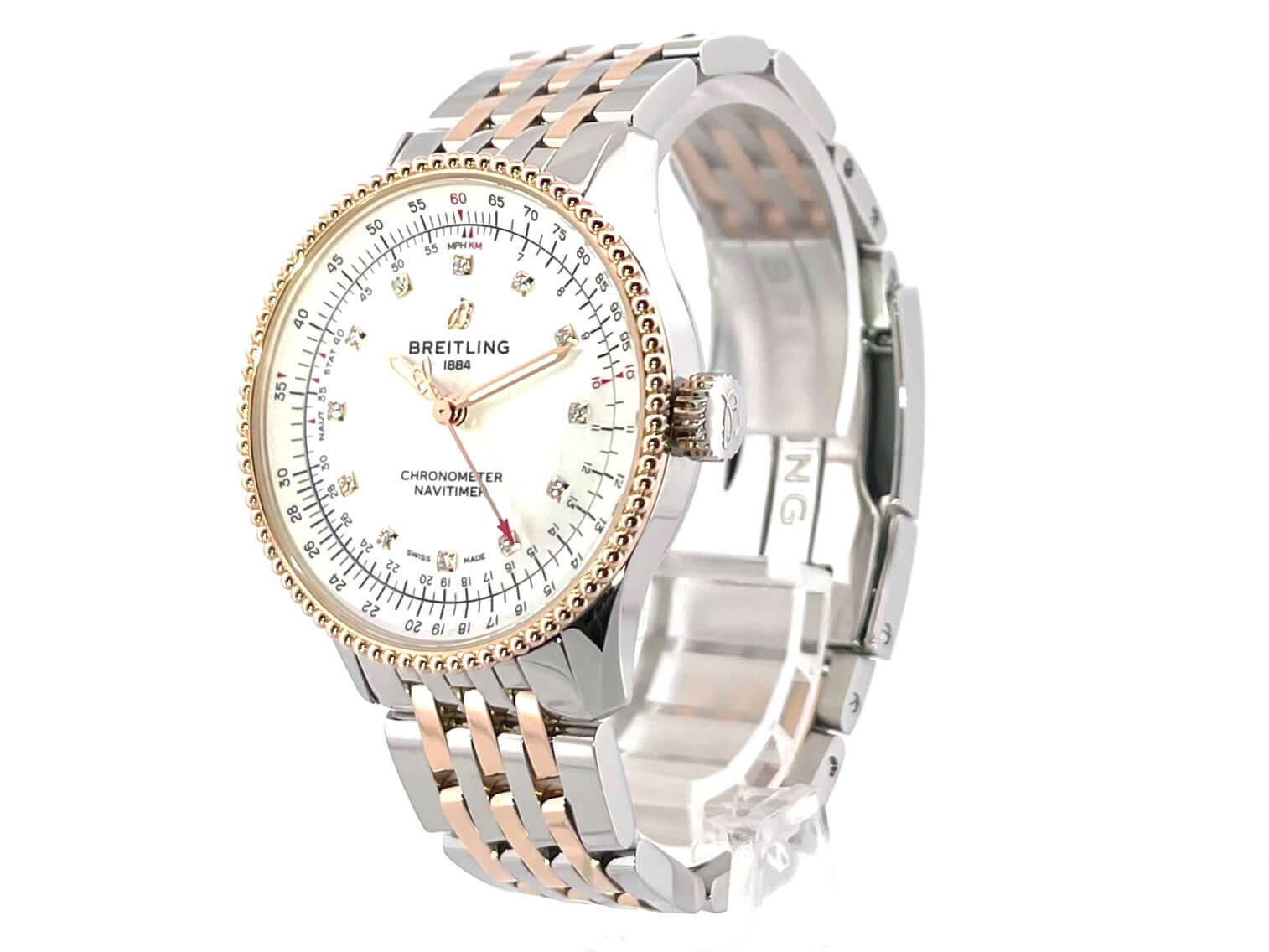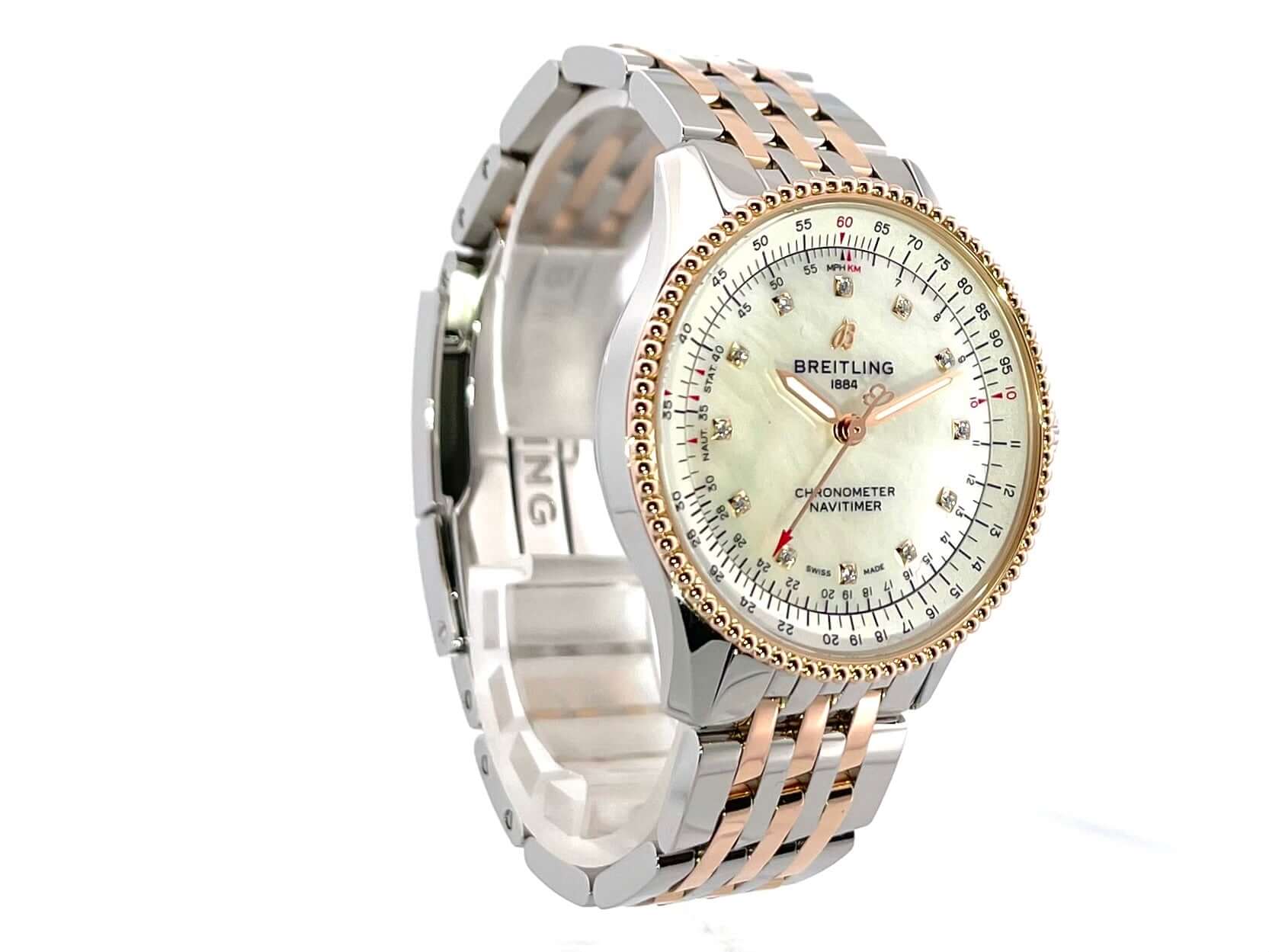 Gehäuse aus Edelstahl poliert, Gehäusedurchmesser 35 mm, Gehäusehöhe 9,9 mm, drehbare 18 kt Rotgold Lünette mit Rechenschieber, Perlmutt Zifferblatt mit aufgesetzten Diamanten, Leuchtzeiger, Edelstahl / 18 kt Rotgold Band mit Faltschließe, Automatik, Kaliber Breitling 17, 25 Steine, 28.800 A/h, Gangreserve ca. 40 Stunden, Datum, Chronometer, Zentralsekunde, Saphirglas, Edelstahlboden verschraubt, Wasserdicht bis zu 3 bar.