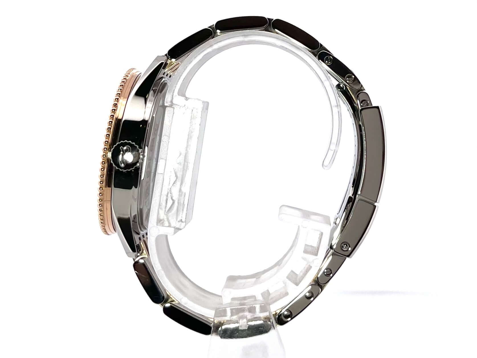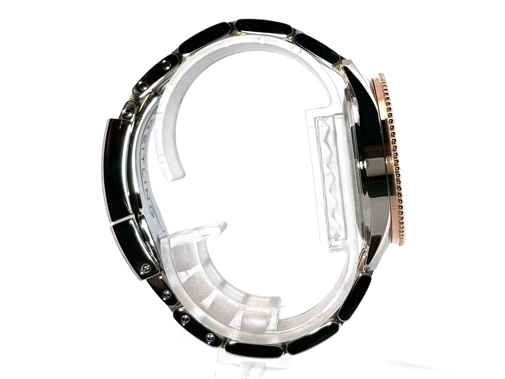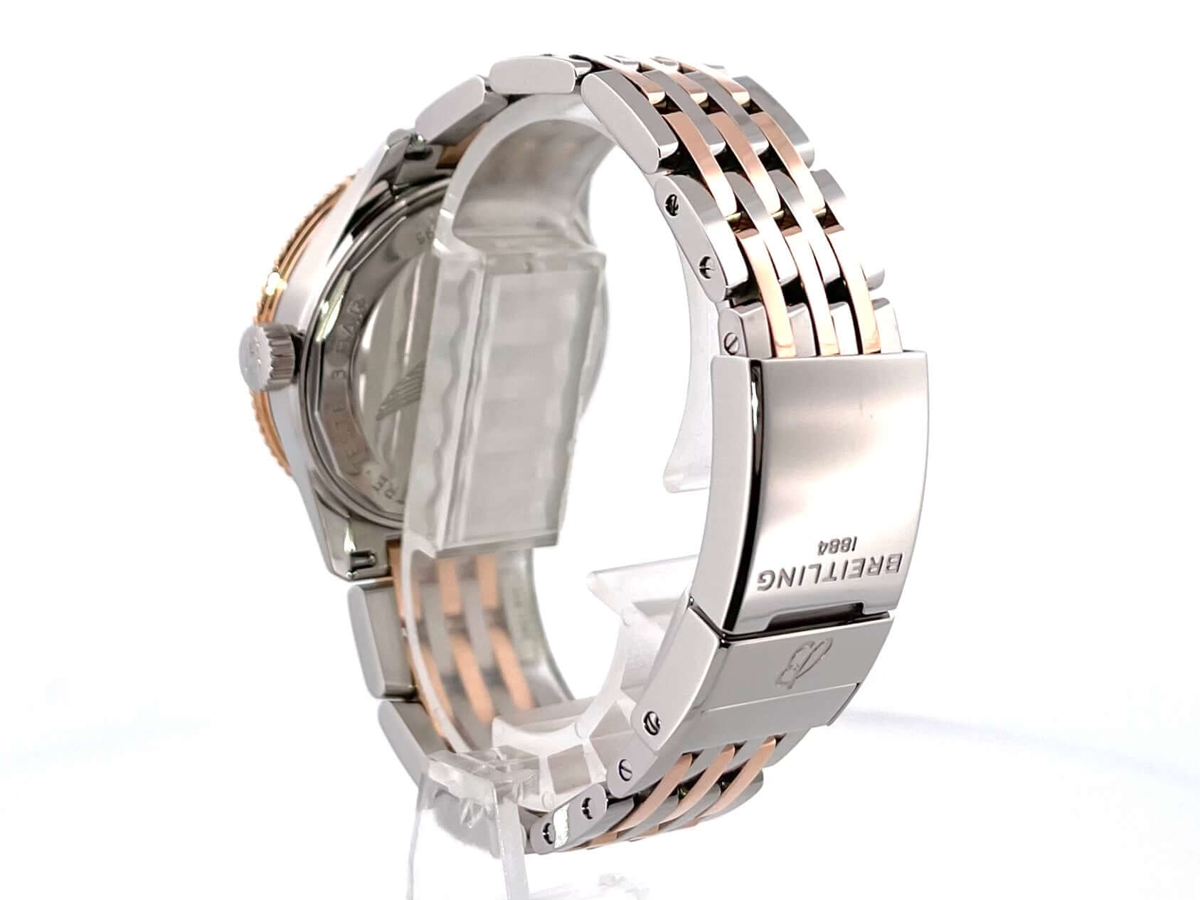 Gehäuse aus Edelstahl poliert, Gehäusedurchmesser 35 mm, Gehäusehöhe 9,9 mm, drehbare 18 kt Rotgold Lünette mit Rechenschieber, Perlmutt Zifferblatt mit aufgesetzten Diamanten, Leuchtzeiger, Edelstahl / 18 kt Rotgold Band mit Faltschließe, Automatik, Kaliber Breitling 17, 25 Steine, 28.800 A/h, Gangreserve ca. 40 Stunden, Datum, Chronometer, Zentralsekunde, Saphirglas, Edelstahlboden verschraubt, Wasserdicht bis zu 3 bar.
