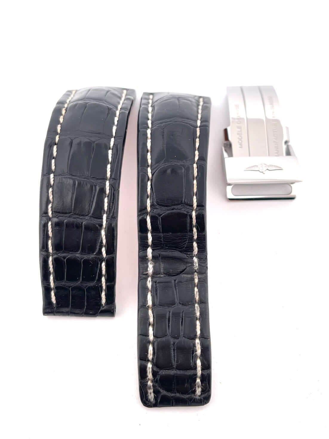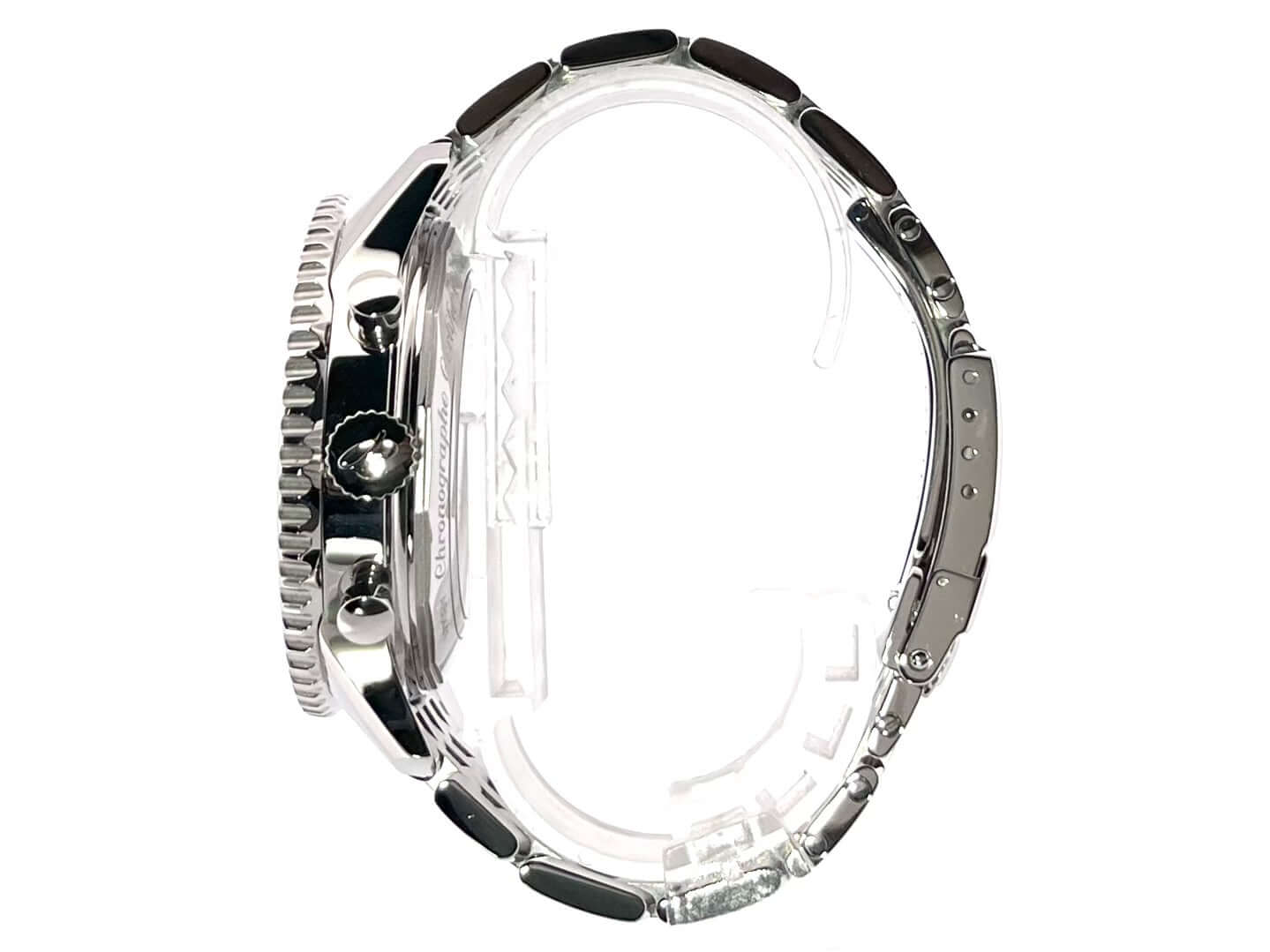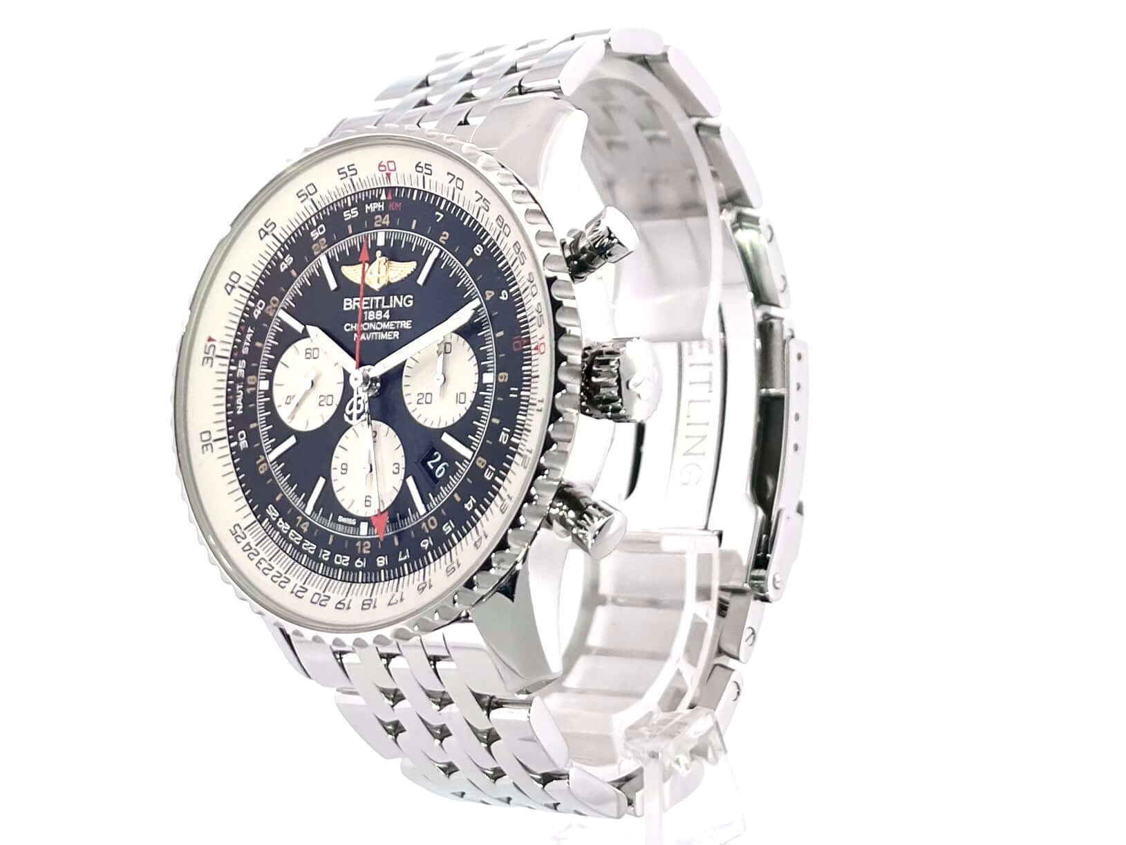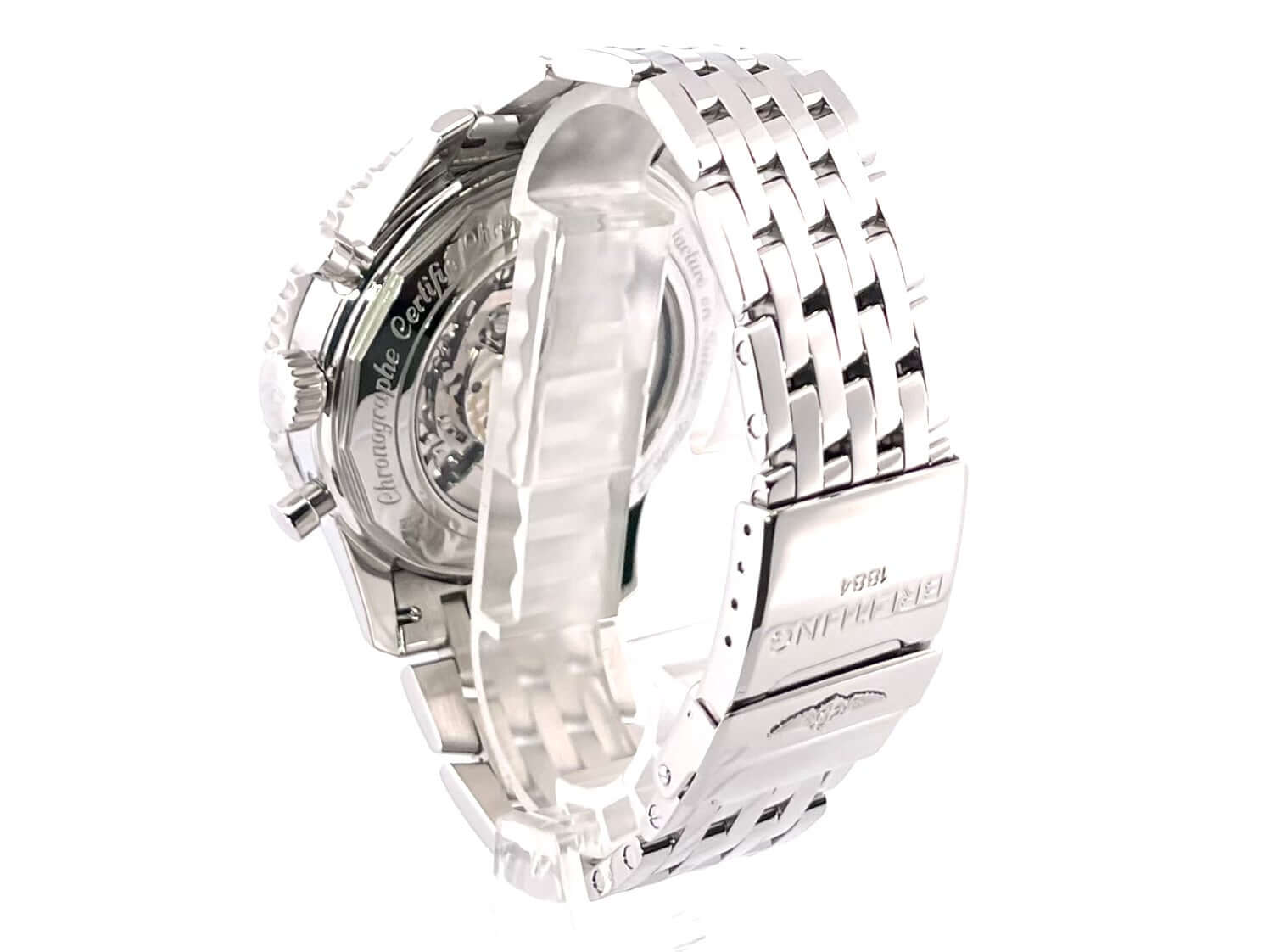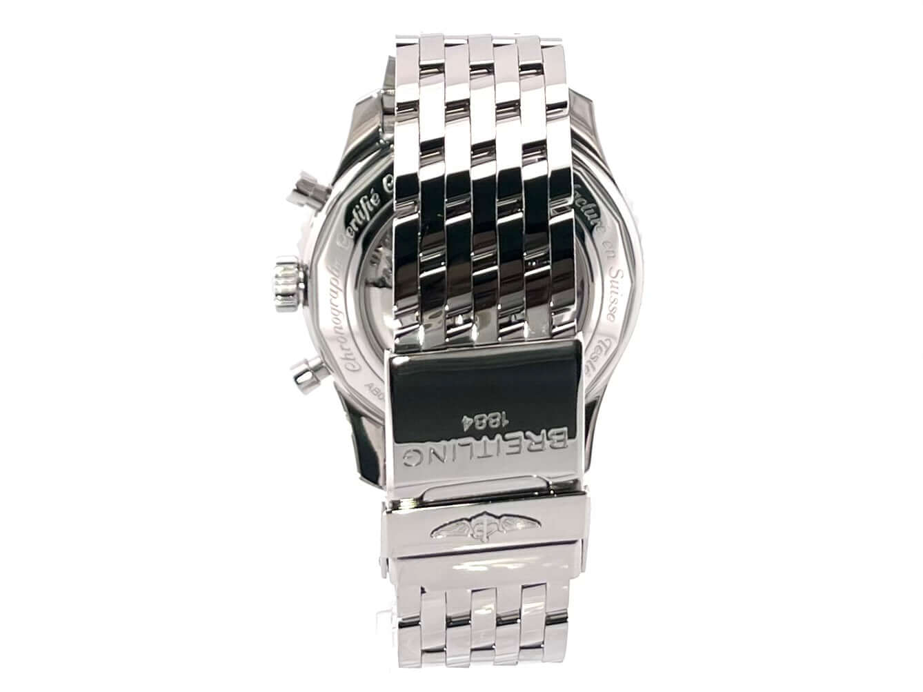 Gehäuse Edelstahl poliert, Gehäusedurchmesser 48 mm, Gehäusehöhe 15,80 mm, Edelstahl Lünette mit unterglas Rechenschieber, beidseitig drehbar, Edelstahlarmband poliert mit Faltschließe, extra Lederband mit Faltschließe, schwarzes Zifferblatt mit aufgesetzten Leuchtindexen, Leuchtpunkten und Leuchtzeiger, Totalisatoren silberfarben, Uhrwerk Automatik, Chronograph, Kaliber Breitling B04, 47 Steine, 28.800 A/h, Gangreserve 70 Stunden, kleine Sekunde, Datumsanzeige, 24 Stunden Anzeige (zweite Zeitzone) über Zeiger mit roter Spitze, Chronometer, Saphirglas, Edelstahlboden verschraubt, graviert mit Sichtfenster, Wasserdicht bis zu 3 bar