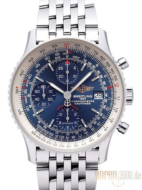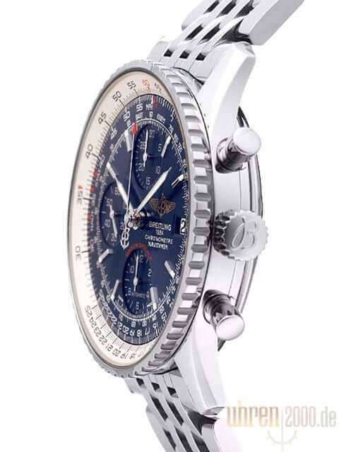 Gehäuse aus Edelstahl poliert, Gehäusedurchmesser 42 mm, Gehäusehöhe 14,6 mm, Edelstahl Lünette gerädelt mit Rechenschieber, beidseitig drehbar, Edelstahlband mit Faltschließe, blaues Zifferblatt mit aufgesetzten Leuchtindexen, Leuchtzeiger, Automatikwerk, Chronometer mit Zeugnis, Manufakturkaliber Breitling 13 mit 25 Steine, 28.800 A/h, Gangreserve ca. 42 Stunden, Datumsanzeige, Saphirglas doppelseitig entspiegelt, Edelstahlboden verschraubt und graviert, Wasserdicht bis zu 3 bar.