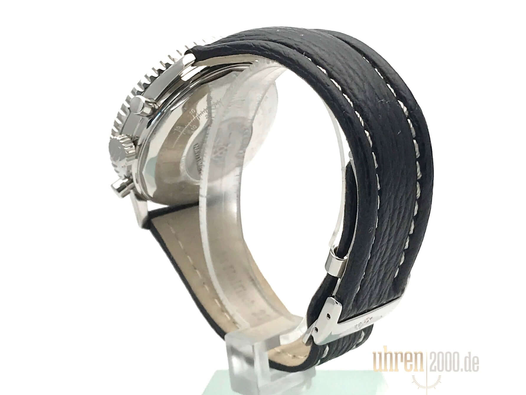 Gehäuse aus Edelstahl poliert und satiniert, Gehäusedurchmesser 41,5 mm, Gehäusehöhe 14,2 mm, Lünette Edelstahl gerädelt mit Rechenschieber und drehbar, schwarzes Lederband mit Faltschließe, schwarzes Zifferblatt mit aufgesetzten Indizes, Leuchtzeiger, Automatikwerk, C.O.S.C. Zertifiziert, Breitling 13, Schwingung: 28.800 A/h, Gangreserve für ca. 42 Stunden, Datumsanzeige, bombiertes Saphirglas doppelseitig entspiegelt, Boden aus Edelstahl verschraubt und graviert, Wasserdicht bis zu 3 bar.