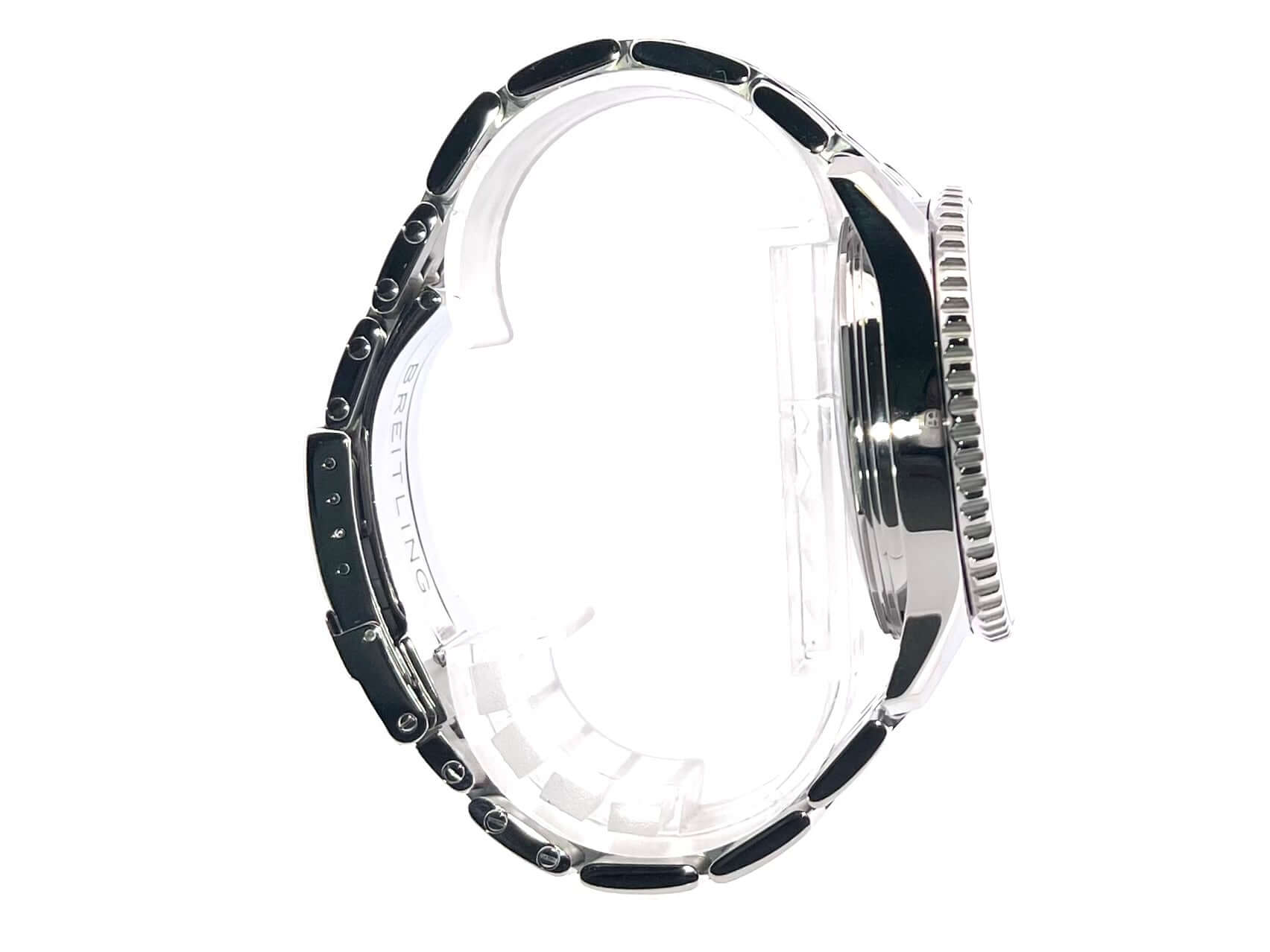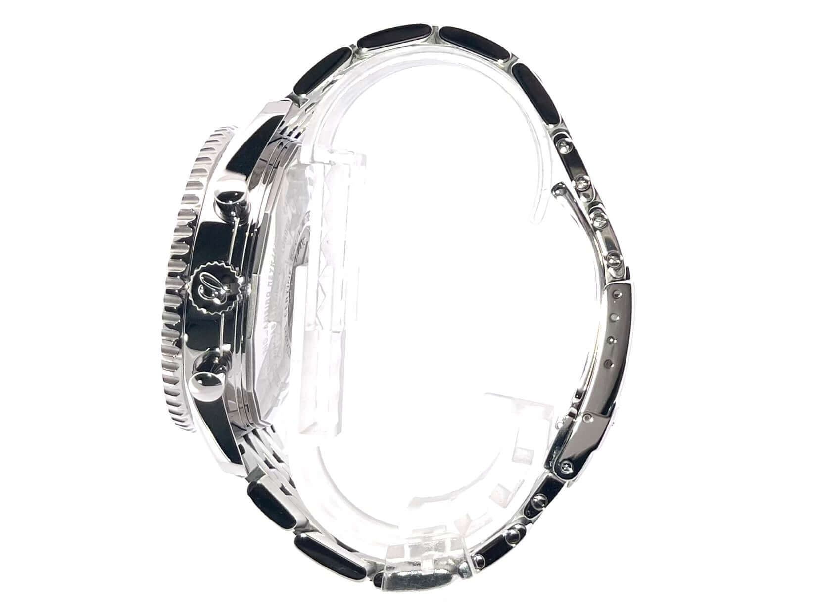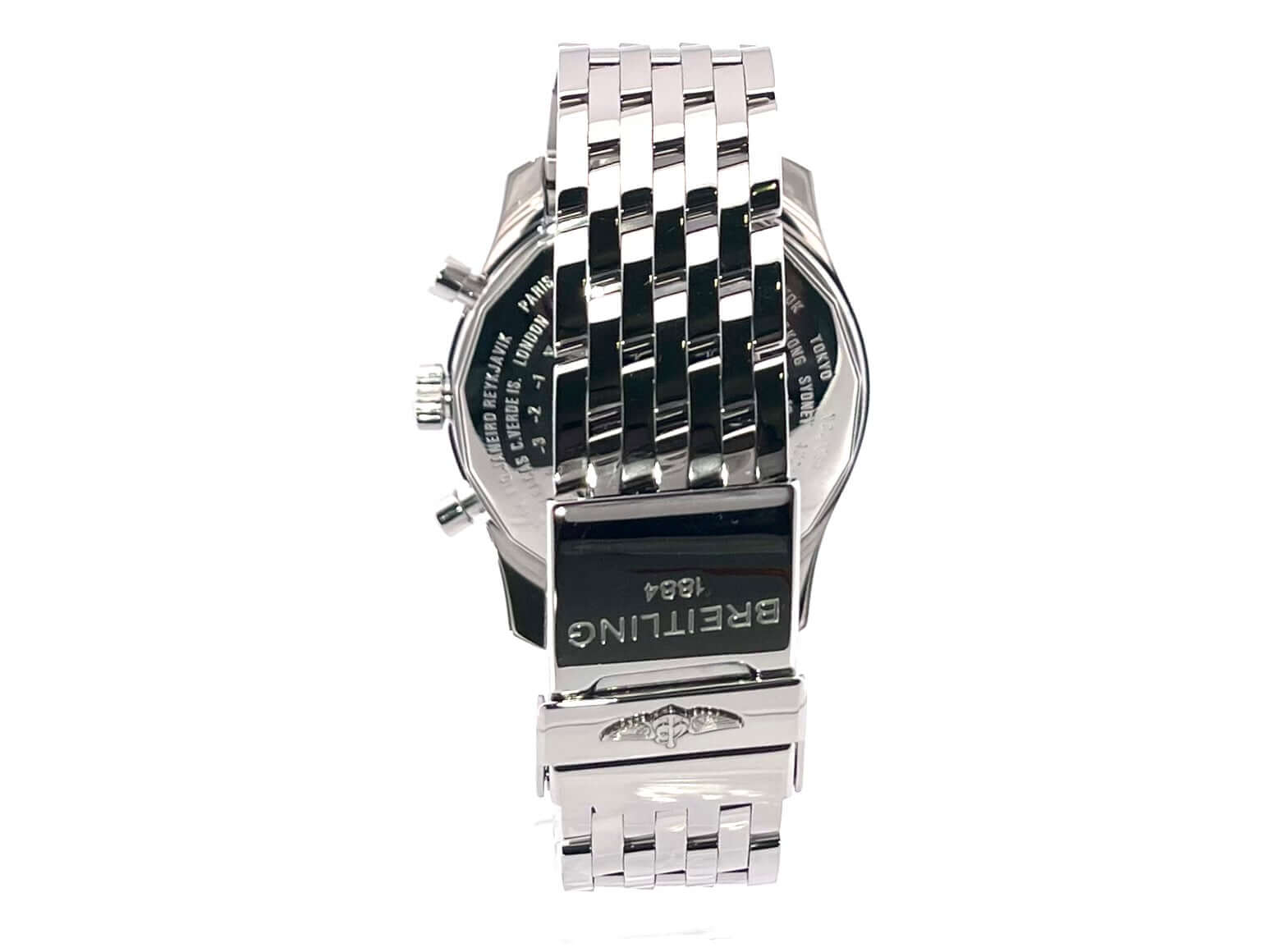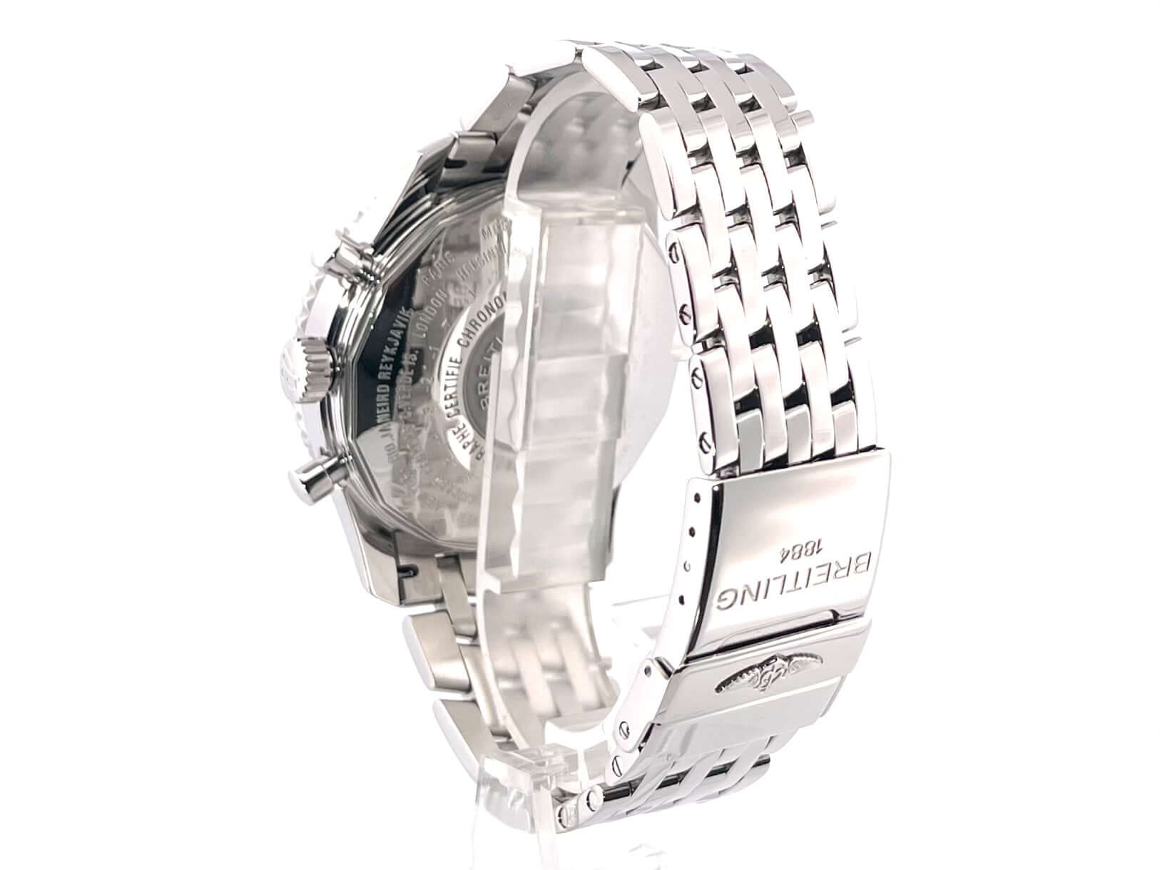 Gehäuse Edelstahl poliert, Gehäusedurchmesser 46 mm, Gehäusehöhe 15,50 mm, Edelstahl Lünette mit unterglas Rechenschieber, beidseitig drehbar, Edelstahlband mit Faltschließe, schwarzes Zifferblatt mit aufgesetzten Leuchtindizes, Leuchtzeiger, Automatik, Kaliber Breitling 24, 25 Steine, 28.800 A/h, Gangreserve ca. 42 Stunden, Datumsanzeige, Chronograph, Chronometer, 24 Stunden Anzeige (zweite Zeitzone) über Zeiger mit roter Spitze, kleine Sekunde, Saphirglas, Edelstahlboden verschraubt und graviert, wasserdicht bis zu 3 bar.