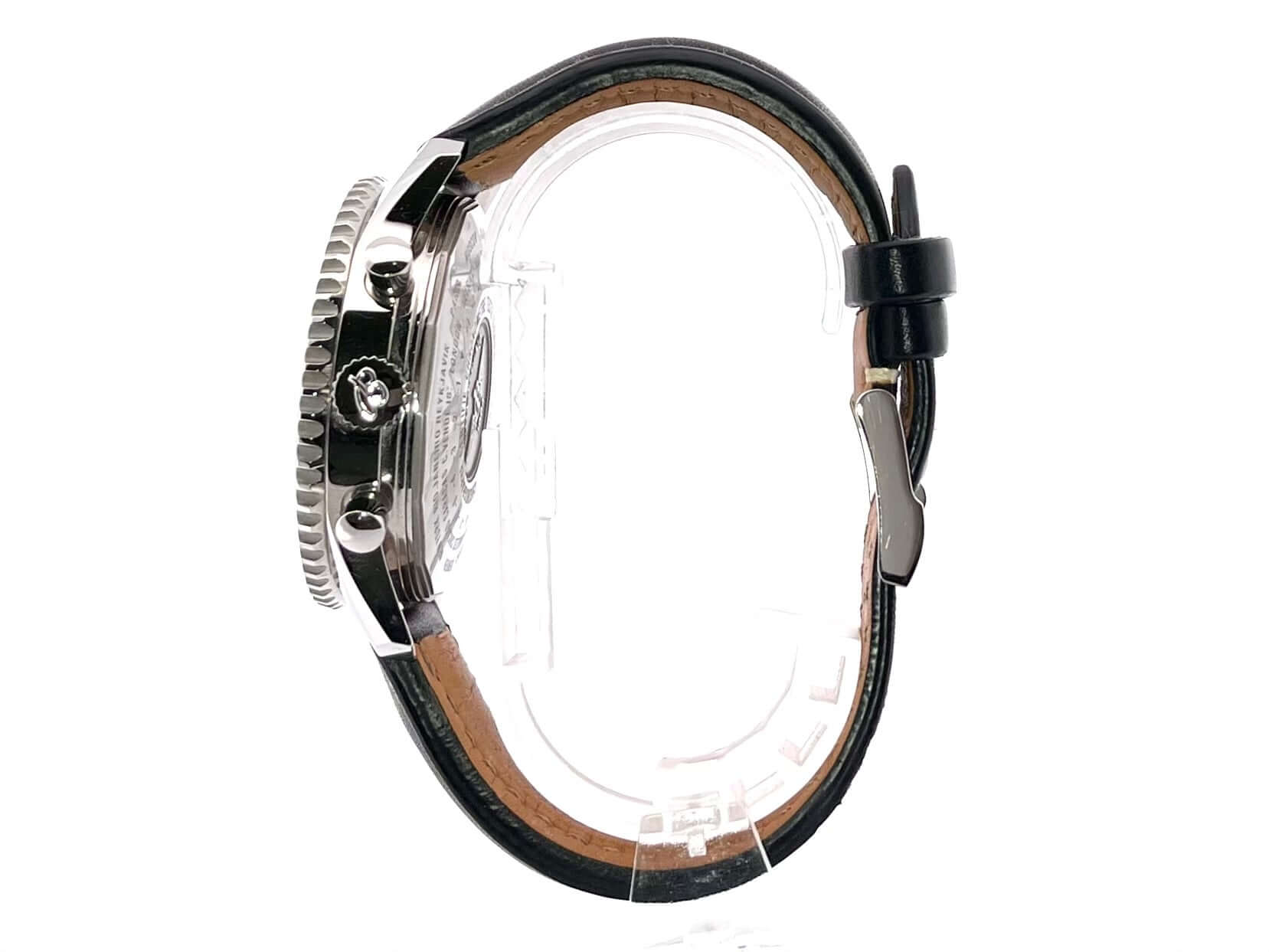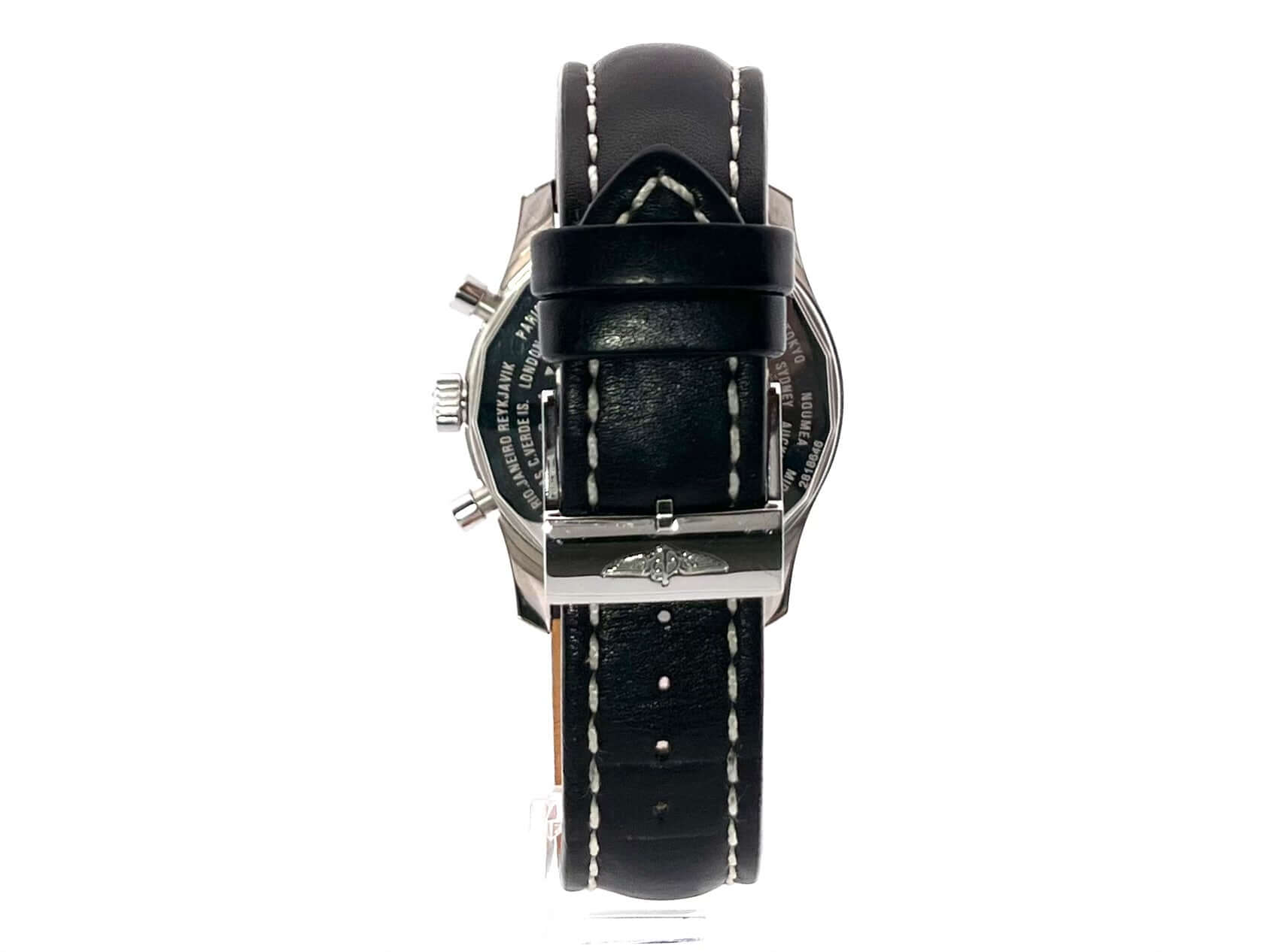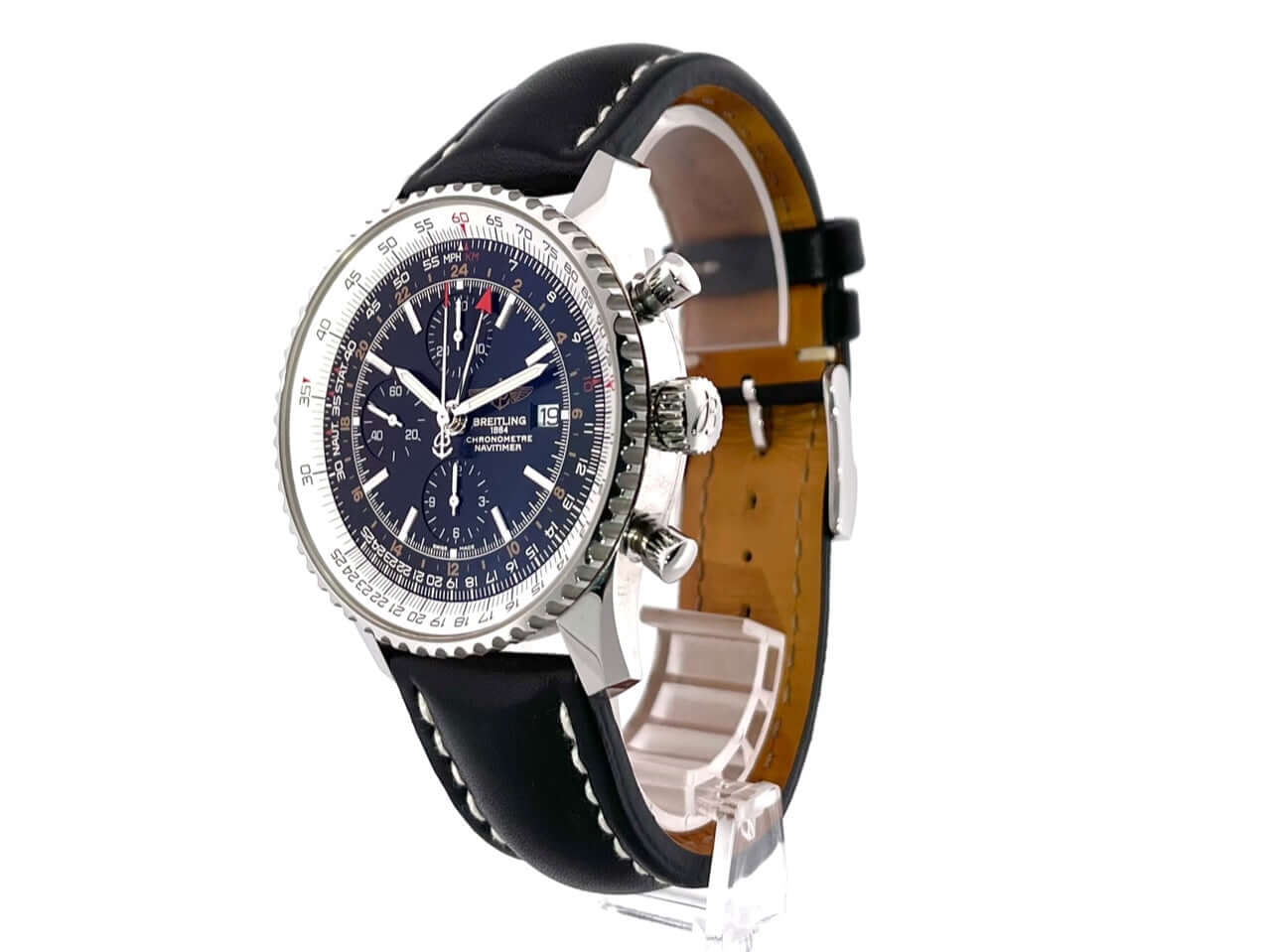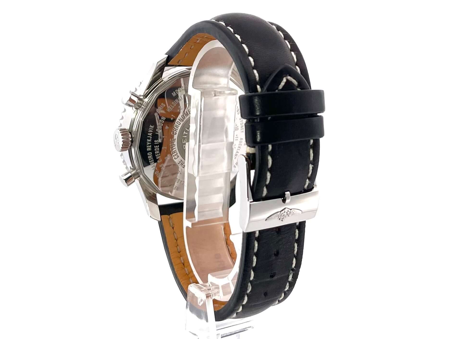 Gehäuse Edelstahl poliert, Gehäusedurchmesser 46 mm, Gehäusehöhe 15,50 mm, Edelstahl Lünette mit unterglas Rechenschieber, beidseitig drehbar, schwarzes Leder Armband mit weißer Ziernaht und Dornschließe, schwarzes Zifferblatt mit aufgesetzten Leuchtindizes, Leuchtpunkten und Leuchtzeiger, Automatik, Kaliber Breitling 24, 25 Steine, 28.800 A/h, Gangreserve ca. 42 Stunden, kleine Sekunde, Datumsanzeige, Chronograph, Chronometer, 24 Stunden Anzeige (zweite Zeitzone) über Zeiger mit roter Spitze, Saphirglas, Edelstahlboden verschraubt und graviert, Wasserdicht bis zu 3 bar.
