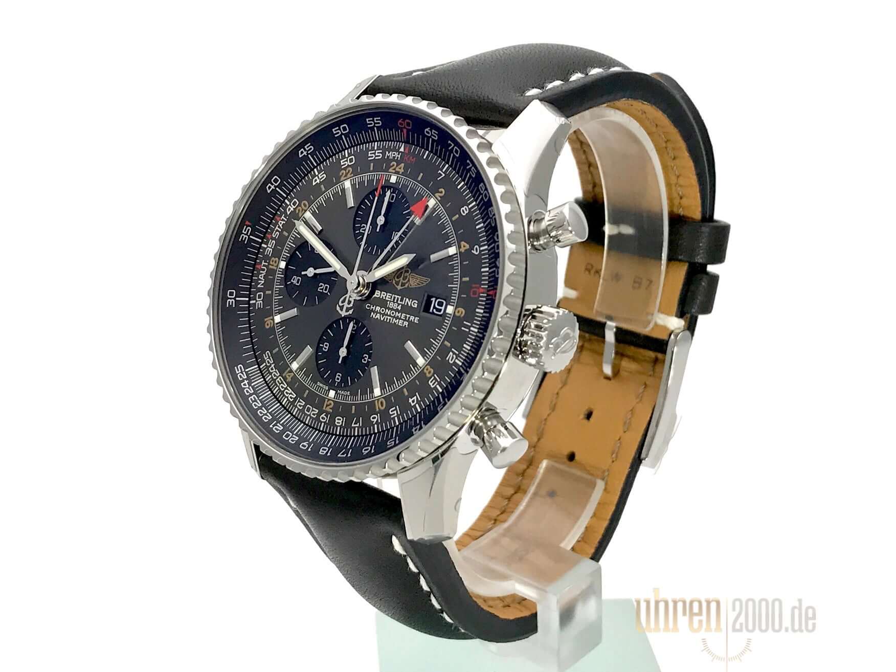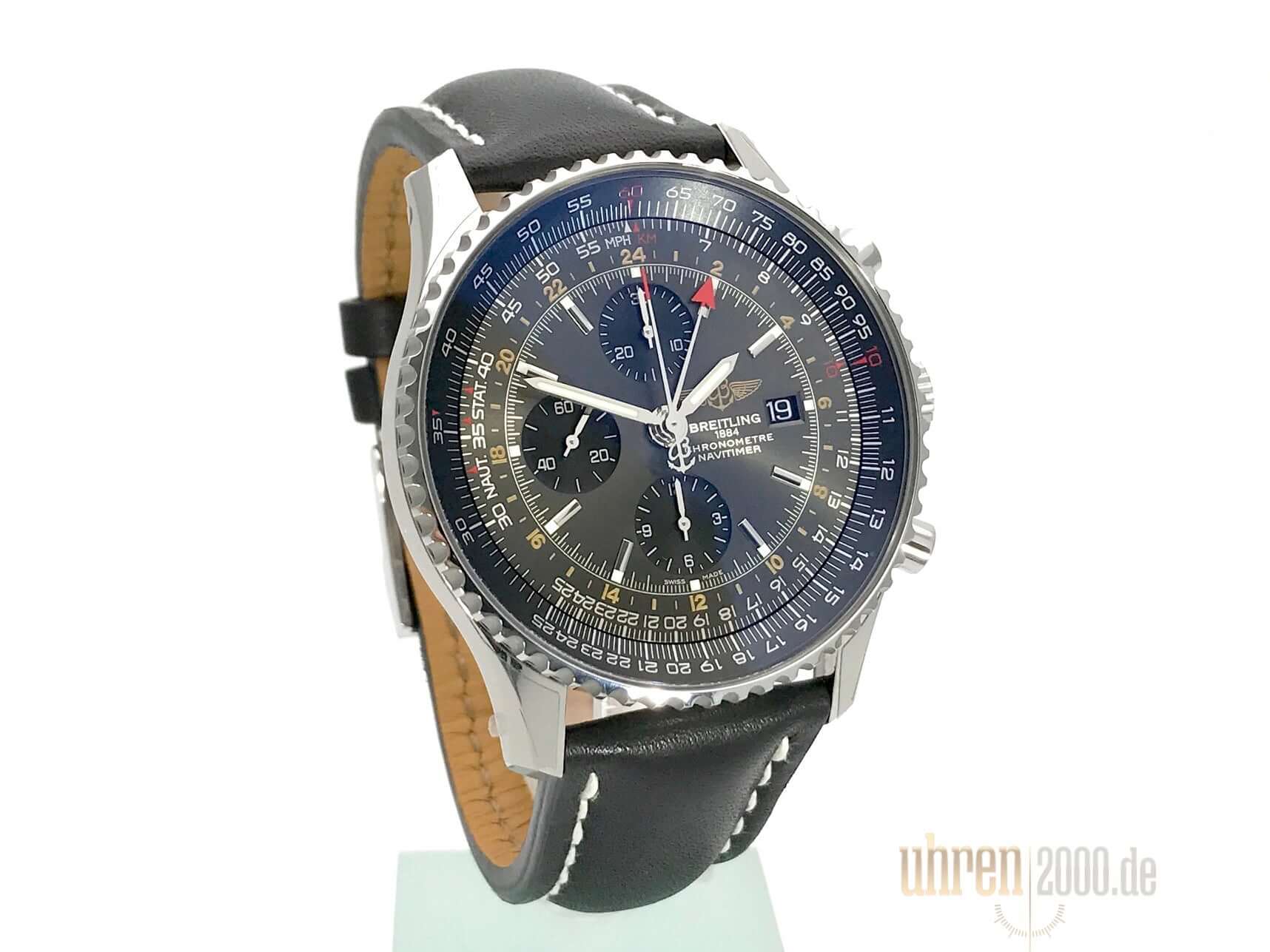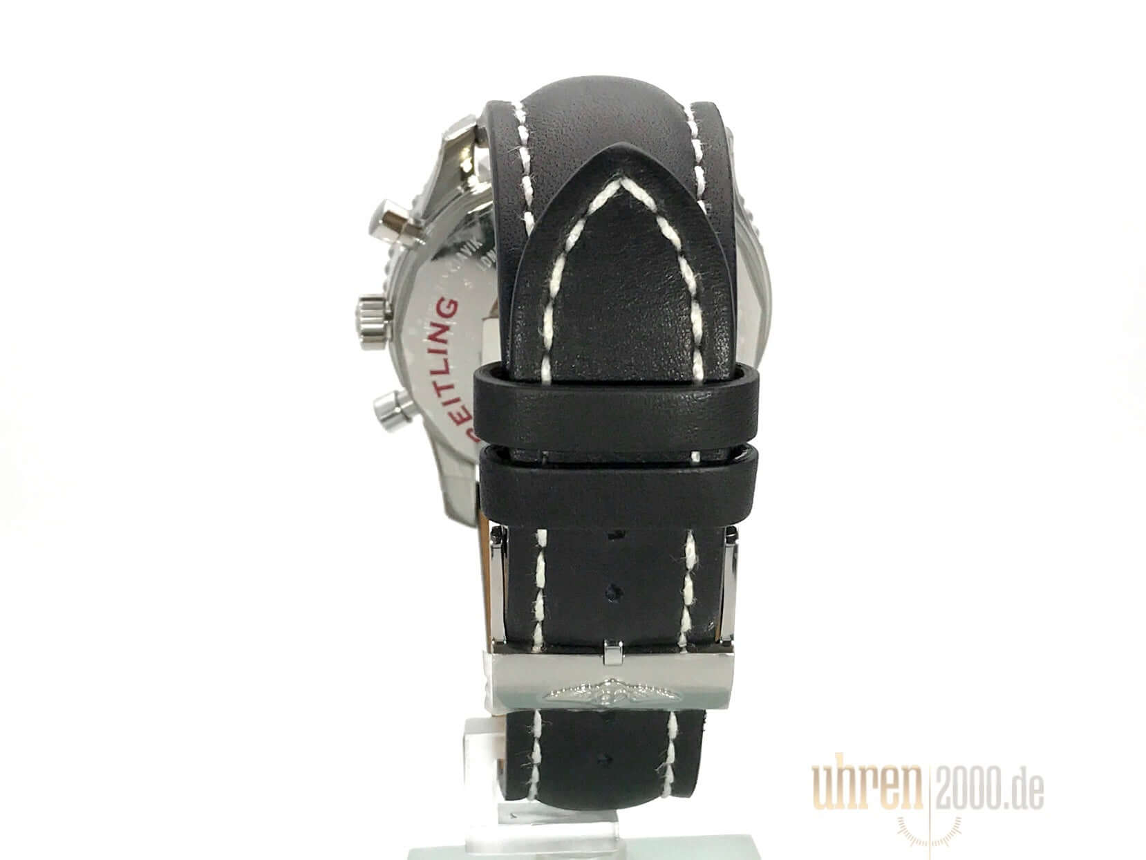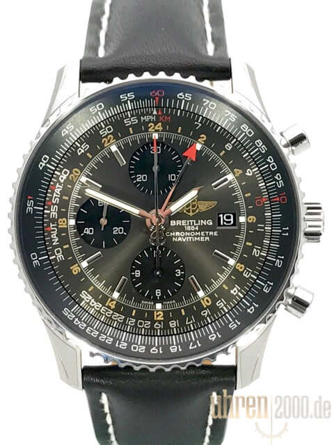 Gehäuse aus Edelstahl poliert und satiniert, Gehäusedurchmesser 46 mm, Gehäusehöhe 15,3 mm, Edelstahl Lünette gerädelt, Rechenschieber drehbar, schwarzes Lederband mit Dornschließe, graues Zifferblatt mit aufgesetzten Index, Leuchtpunkten, Leuchtzeiger, Automatikwerk, Chronograph, Breitling 24 mit 25 Steine, 28.800 A/h, Gangreserve ca. 42 Stunden, Datumsanzeige, GMT, bombiertes Saphirglas doppelseitig entspiegelt, Edelstahlboden verschraubt und graviert, Wasserdicht bis zu 3 bar.