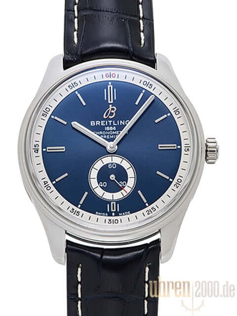 Gehäuse Edelstahl poliert und satiniert, Gehäusedurchmesser 40 mm, Gehäusehöhe 11,4 mm, Edelstahl Lünette poliert, blaues Krokolederband mit Dornschließe, blaues Zifferblatt mit aufgesetzten Indexen und Leuchtpunkten, Leuchtzeiger, Automatikwerk, Breitling 37 mit 27 Steine, 28.800 A/h, Gangreserve ca. 38 Stunden, Chronometer, kleine Sekunde, Saphirglas beidseitig entspiegelt, Edelstahlboden verschraubt und graviert, Wasserdicht bis zu 10 bar.