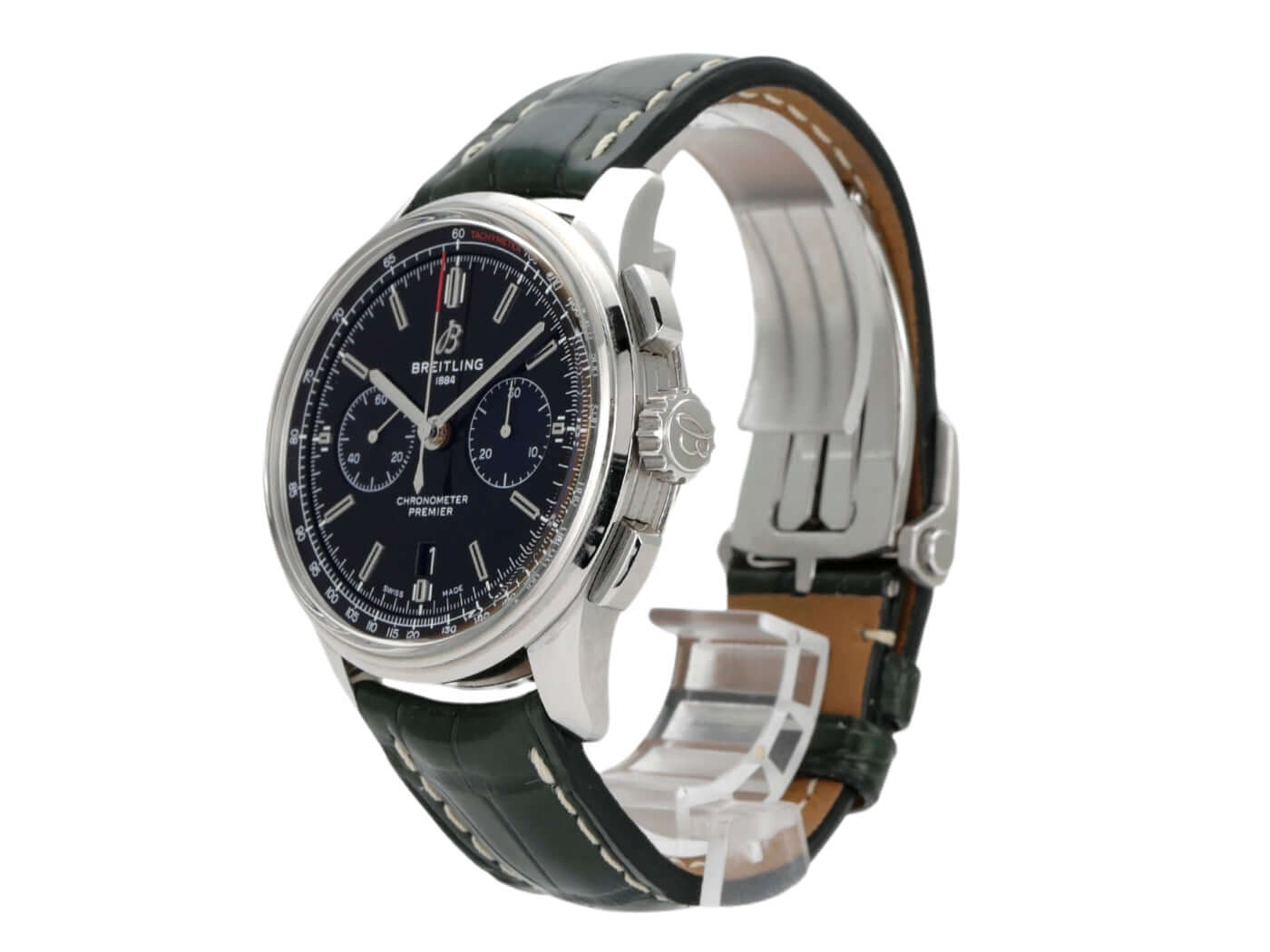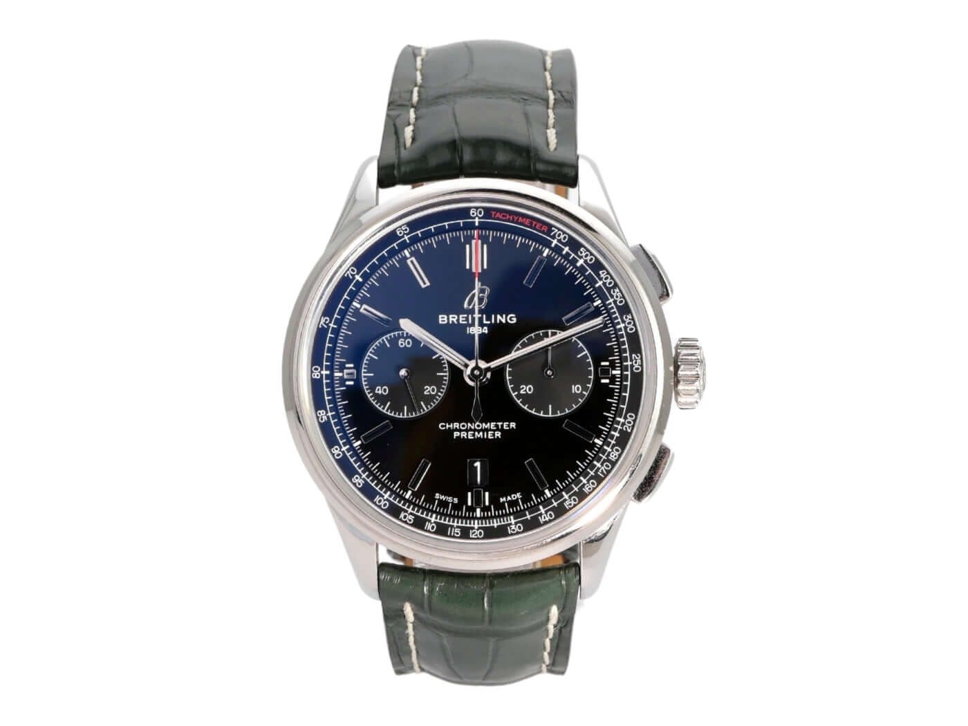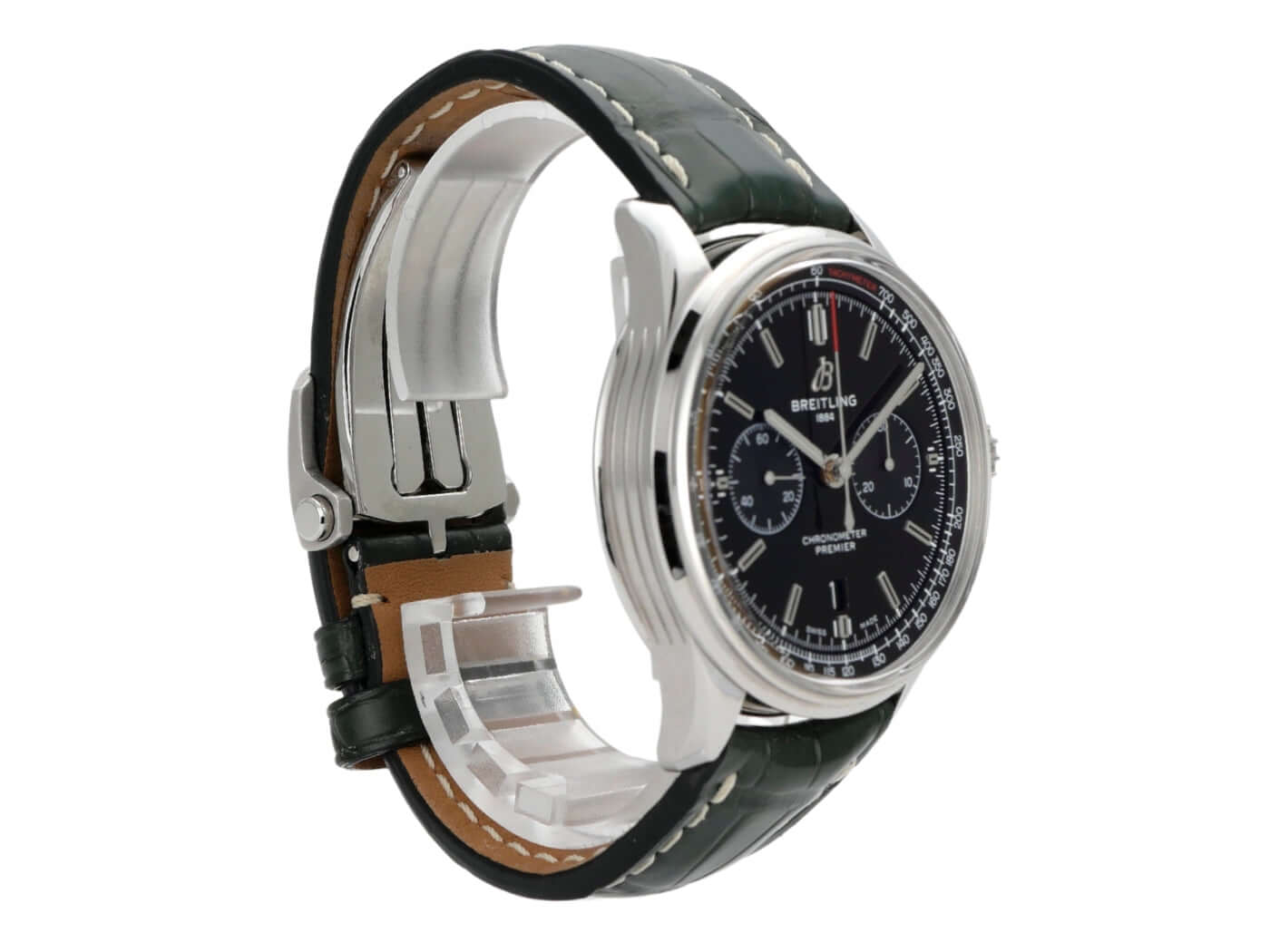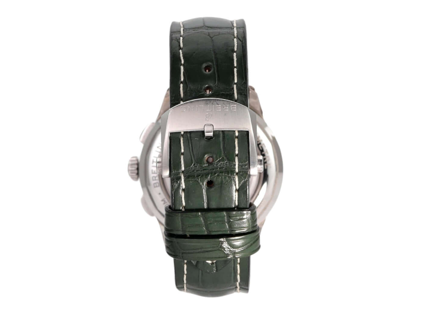 Gehäuse aus Edelstahl poliert und satiniert, Gehäusedurchmesser 42 mm, Gehäusehöhe 13,65 mm, polierte Edelstahl Lünette, grünes Krokoleder mit Faltschließe, grünes Zifferblatt mit aufgesetzten Leuchtindizes, graue Totalisatoren, Leuchtzeiger, Automatikwerk, Manufakturkaliber Breitling 01 mit 41 Steine, 28.800 A/h, Gangreserve ca. 70 Stunden, Chronograph, Datumsanzeige, Chronometer, bombiertes Saphirglas doppelseitig entspiegelt, Edelstahlboden verschraubt, graviert mit Sichtfenster, wasserdicht bis zu 10 bar.