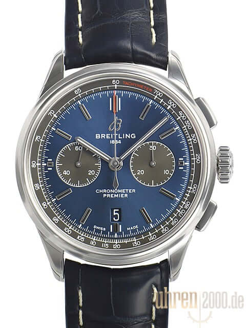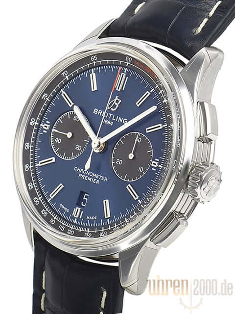 Gehäuse aus Edelstahl poliert und satiniert, Gehäusedurchmesser 42 mm, Gehäusehöhe 13,65 mm, polierte Edelstahl Lünette, blaues Krokoleder mit Faltschließe, blaues Zifferblatt mit aufgesetzten Leuchtindizes, schwarze Totalisatoren, Leuchtzeiger, Automatikwerk, Manufakturkaliber Breitling 01 mit 47 Steine, 28.800 A/h, Gangreserve ca. 70 Stunden, Chronograph, Datumsanzeige, Chronometer, bombiertes Saphirglas doppelseitig entspiegelt, Edelstahlboden verschraubt, graviert mit Sichtfenster, Wasserdicht bis zu 10 bar.