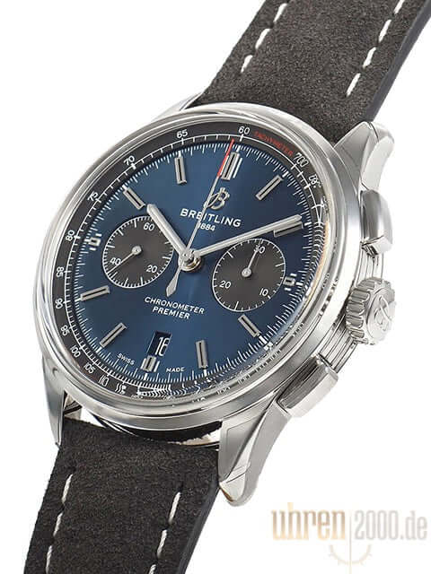 Gehäuse aus Edelstahl poliert und satiniert, Gehäusedurchmesser 42 mm, Gehäusehöhe 13,65 mm, polierte Edelstahl Lünette, anthrazitgraues Nubuckleder mit Faltschließe, blaues Zifferblatt mit aufgesetzten Leuchtindizes, schwarze Totalisatoren, Leuchtzeiger, Automatikwerk, Manufakturkaliber Breitling 01 mit 47 Steine, 28.800 A/h, Gangreserve ca. 70 Stunden, Chronograph, Datumsanzeige, Chronometer, bombiertes Saphirglas doppelseitig entspiegelt, Edelstahlboden verschraubt, graviert mit Sichtfenster, Wasserdicht bis zu 10 bar.