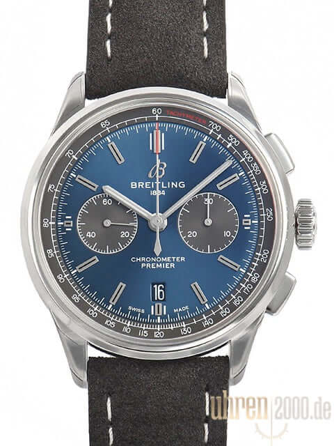 Gehäuse aus Edelstahl poliert und satiniert, Gehäusedurchmesser 42 mm, Gehäusehöhe 13,65 mm, polierte Edelstahl Lünette, anthrazitgraues Nubuckleder mit Dornschließe, blaues Zifferblatt mit aufgesetzten Leuchtindizes, schwarze Totalisatoren, Leuchtzeiger, Automatikwerk, Manufakturkaliber Breitling 01 mit 47 Steine, 28.800 A/h, Gangreserve ca. 70 Stunden, Chronograph, Datumsanzeige, Chronometer, bombiertes Saphirglas doppelseitig entspiegelt, Edelstahlboden verschraubt, graviert mit Sichtfenster, Wasserdicht bis zu 10 bar.