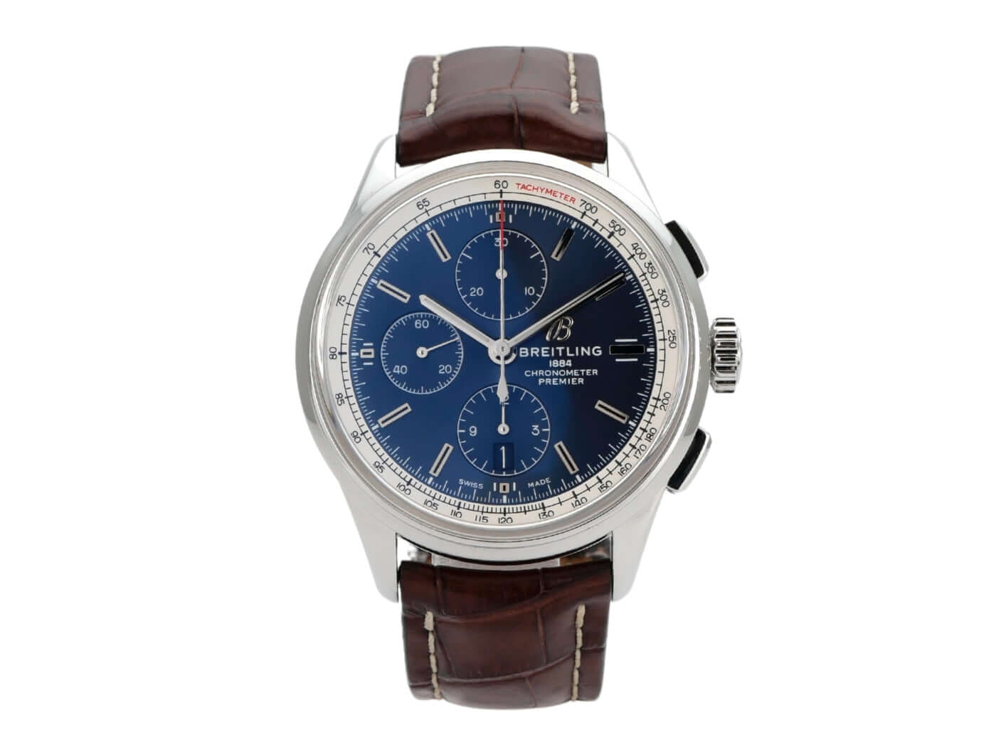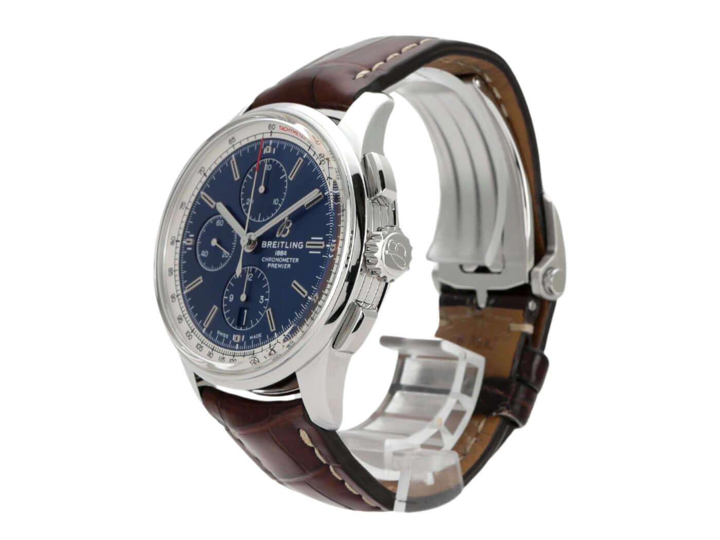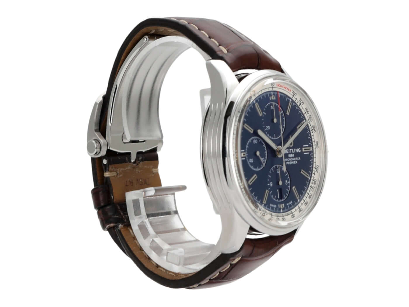 Gehäuse aus Edelstahl poliert und satiniert, Gehäusedurchmesser 42 mm, Gehäusehöhe 13,8 mm, polierte Edelstahl Lünette, braunes Krokolederband mit Faltschließe, blaues Zifferblatt mit aufgesetzten Leuchtindizes, blaue Totalisatoren, Leuchtzeiger, Automatikwerk, Breitling 13 mit 25 Steine, 28.800 A/h, Gangreserve ca. 42 Stunden, Chronograph, Datumsanzeige, Chronometer, bombiertes Saphirglas doppelseitig entspiegelt, Edelstahlboden verschraubt, Wasserdicht bis zu 10 bar.