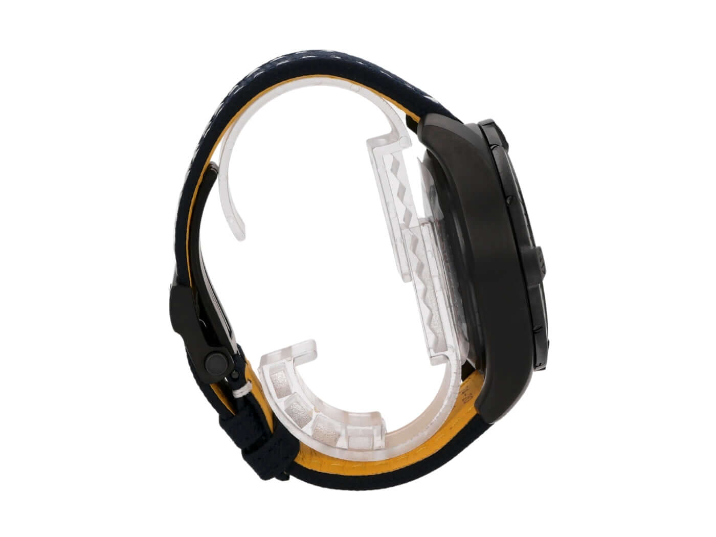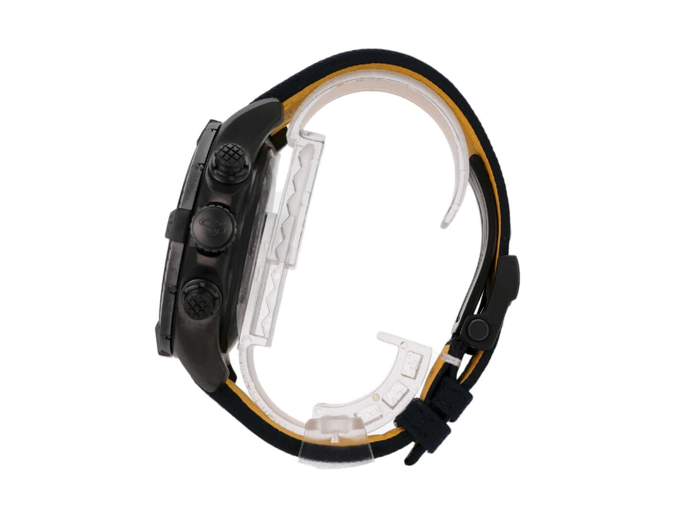 Gehäuse aus DLC-beschichtetem Titan satiniert, Gehäusedurchmesser 48 mm, Gehäusehöhe 17,73 mm, DLC-beschichtete Titan Lünette satiniert mit Leuchtpunkt, einseitig drehbar mit Sperre, blaues Militärlederarmband mit Faltschließe, blaues Zifferblatt mit aufgesetzten arabischen Leuchtziffern, Leuchtzeiger, blaue Totalisatoren, Automatik, Kaliber Breitling 13 mit 25 Steinen, 28.800 A/h, Gangreserve ca. 42 Stunden, Datumsanzeige, Chronograph, Saphirglas bombiert, doppelseitig entspiegelt, Krone verschraubt mit Flankenschutz, DLC-beschichtetem Titanboden verschraubt, wasserdicht bis zu 30 bar.
