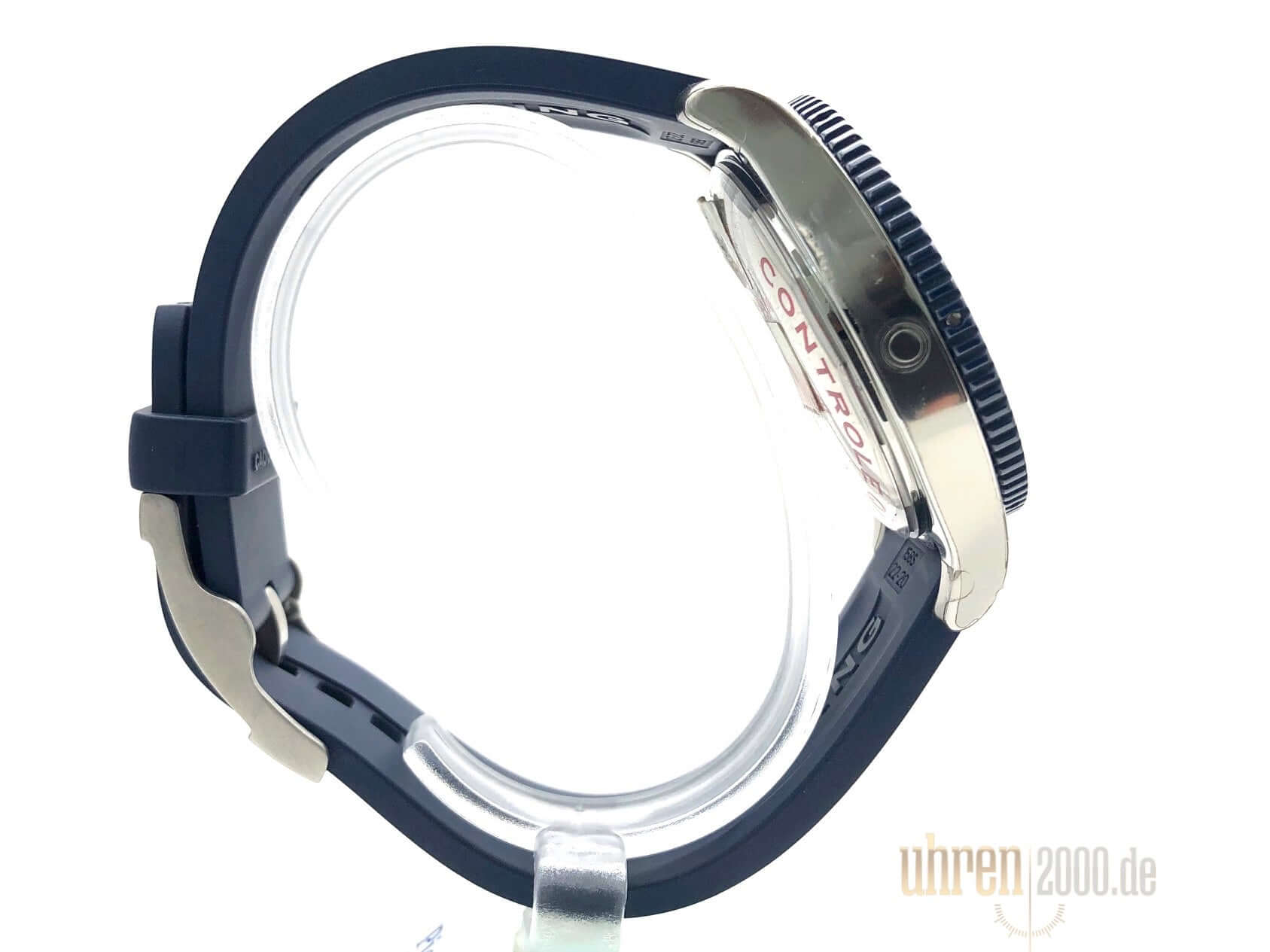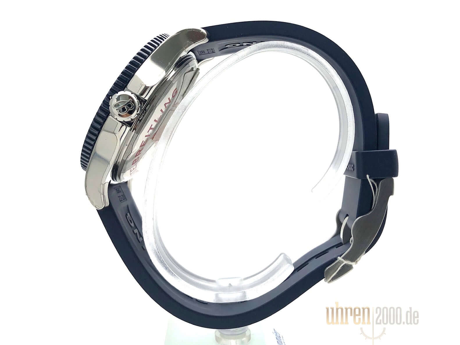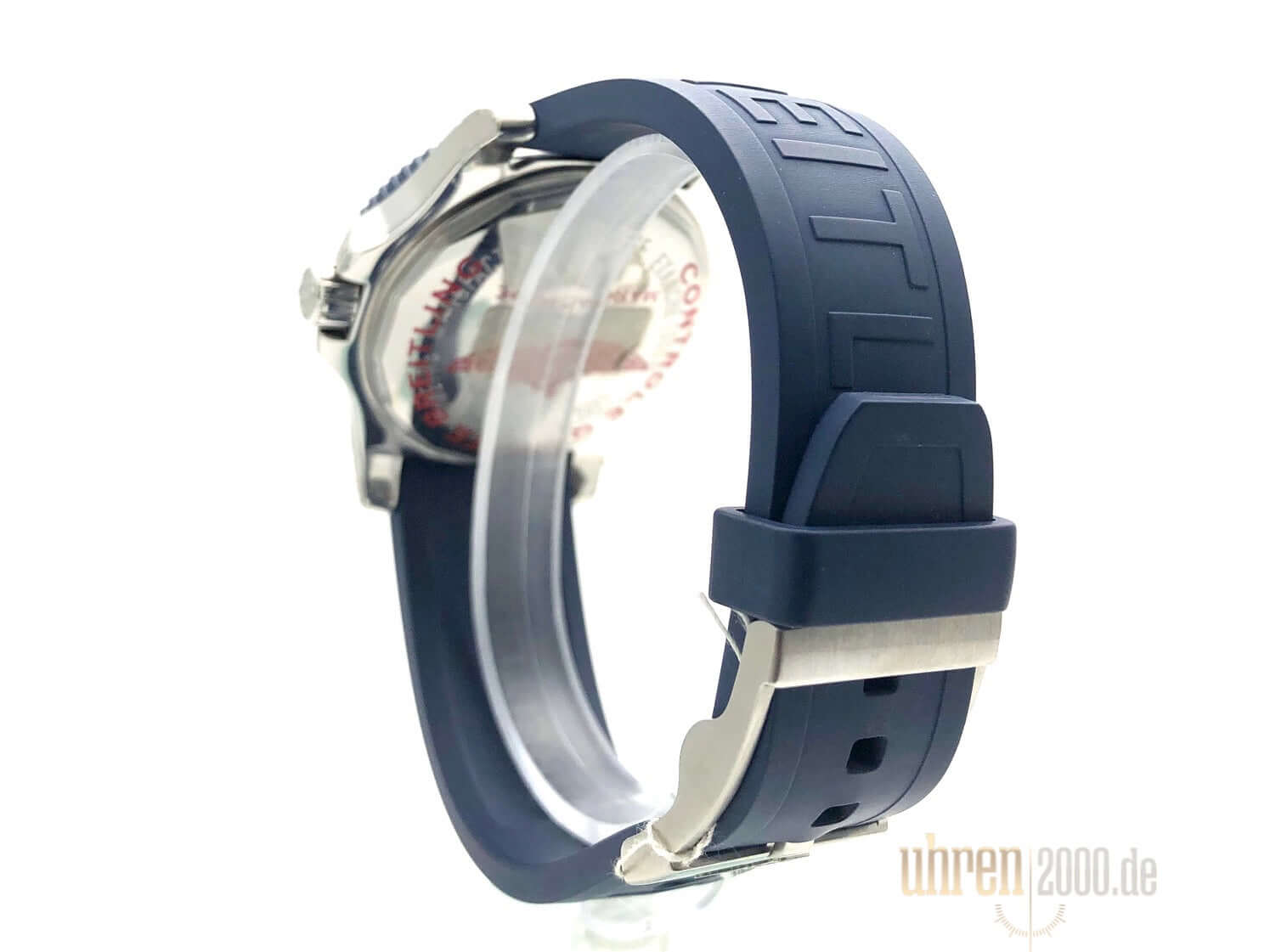 Gehäuse aus Edelstahl satiniert, Gehäusedurchmesser 44 mm, Gehäusehöhe 14,2 mm, Edelstahl Lünette mit blauer Einlage, 60 Minuten Skala, einseitig drehbar mit Sperre, blaues Kautschukband mit Dornschließe, Zifferblatt Mariner-Blau mit aufgesetzten Leuchtindizes, Leuchtzeiger, Sekundenzeiger mit Leuchtspitze, Uhrwerk Automatik, Chronometer mit Zeugnis, Kaliber Breitling 17, 25 Steine, 28.800 A/h, Gangreserve ca. 40 Stunden, Sekundenstopp zur sekundengenauen Einstellung der Uhrzeit, Datum, Saphirglas doppelseitig entspiegelt und bombiert, verschraubte Krone mit Flankenschutz, Edelstahlboden verschraubt, Wasserdicht bis zu 100 bar.