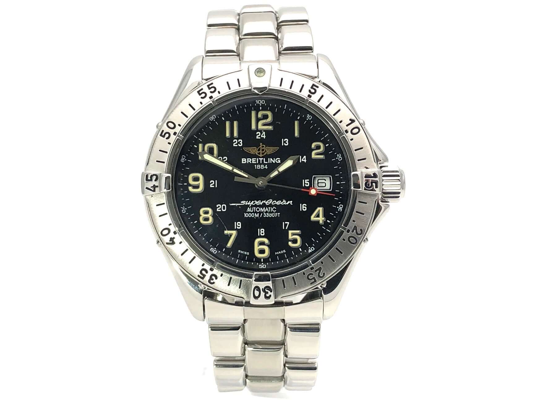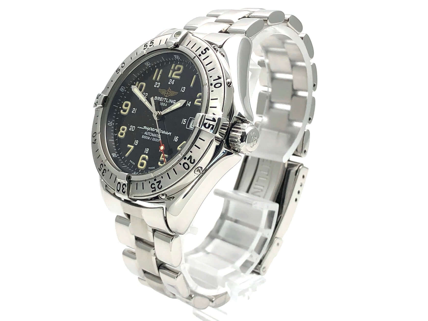 Gehäuse aus Edelstahl poliert, Gehäusedurchmesser 41,5 mm, Gehäusehöhe 15 mm, Lünette Edelstahl mit 60 Minuten Skala, einseitig drehbar mit Sperre, Edelstahlband poliert und satiniert mit Faltschließe, schwarzes Zifferblatt mit aufgesetzten Leuchtindizes und arabischen Ziffern, Leuchtzeiger, Sekundenzeiger mit Leuchtspitze, Automatik, Kaliber Breitling 17 mit 25 Steine, Schwingung 28.800 A/h, Gangreserve bis ca. 40 Stunden, Chronometer, Datum, Saphirglas, Krone verschraubbar mit Flankenschutz, Edelstahlboden verschraubt, Wasserdicht bis zu 100 bar.