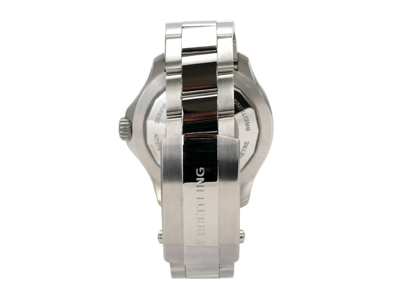 Gehäuse aus Edelstahl poliert und satiniert, Gehäusedurchmesser 44 mm, Gehäusehöhe 12,6 mm, Edelstahl Lünette mit schwarzer Keramik Einlage, einseitig drehbar mit Sperre, Edelstahlband mit Faltschließe, Türkisfarbenes Zifferblatt mit aufgesetzten Leuchtindizes, Leuchtzeiger, Automatik, Kaliber Breitling 17, 25 Steine, 28.800 A/h, Gangreserve ca. 38 Stunden, Chronometer, Sekundenstopp zur sekundengenauen Einstellung der Uhrzeit, Saphirglas doppelseitig entspiegelt und bombiert, verschraubte Krone mit Flankenschutz, Edelstahlboden verschraubt, wasserdicht bis zu 30 bar.