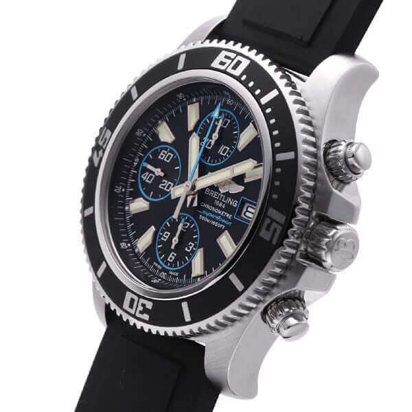 Gehäuse Edelstahl poliert und satiniert, Gehäusedurchmesser 44mm, Gehäusehöhe 17mm, Lünette Stahl mit schwarzer Einlage, einseitig drehbar, Armband Kautschuk mit Faltschließe, Zifferblatt schwarz mit aufgesetzten Leuchtindexen und Leuchtzeiger, Hilfszifferblätter blau umrundet, Uhrwerk Automatik, Chronograph, COSC Zeugnis, Kaliber Breitling 13, 25 Steine, 28.800 A/h, Gangreserve ca. 42 Stunden, Datumsanzeige, Saphirglas, Krone verschraubbar mit Flankenschutz, Boden Edelstahl verschraubt, Wasserdicht bis zu 50 bar.