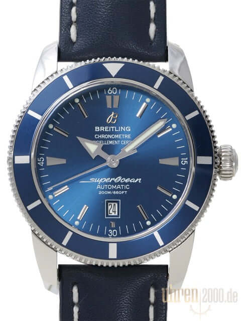 Gehäuse aus Edelstahl poliert und satiniert, Gehäusedurchmesser 46 mm, Gehäusehöhe 13,6 mm, Edelstahl Lünette mit blauer Einlage und 60 Minuten Skala, in eine Richtung drehbar mit Sperre, blaues Zifferblatt mit aufgesetzten Leuchtindexen, Leuchtzeiger, blaues Lederband mit Dornschließe, Uhrwerk Automatik, Kaliber Breitling 17 mit 25 Steine, Schwingung 28.800 A/h, Gangreserve für ca. 40 Stunden, Datumsanzeige, Chronometer mit Zeugnis, Sekundenstopp zur sekundengenauen Einstellung der Uhrzeit, Saphirglas doppelseitig entspiegelt und bombiert, Krone verschraubt, Edelstahlboden verschraubt, Wasserdicht bis zu 20 bar.