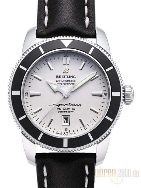 Gehäuse aus Edelstahl poliert und satiniert, Gehäusedurchmesser 46 mm, Gehäusehöhe 13,6 mm, Edelstahl Lünette mit schwarzer Einlage und 60 Minuten Skala, in eine Richtung drehbar mit Sperre, silberfarbenes Zifferblatt mit aufgesetzten Leuchtindexen, Leuchtzeiger, schwarzes Lederband mit Dornschließe, Uhrwerk Automatik, Kaliber Breitling 17 mit 25 Steine, Schwingung 28.800 A/h, Gangreserve für ca. 40 Stunden, Chronometer mit Zeugnis, Datumsanzeige, Sekundenstopp zur sekundengenauen Einstellung der Uhrzeit, Saphirglas doppelseitig entspiegelt und bombiert, Krone verschraubt, Edelstahlboden verschraubt, Wasserdicht bis zu 20 bar.