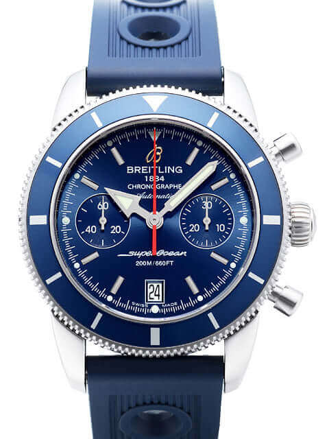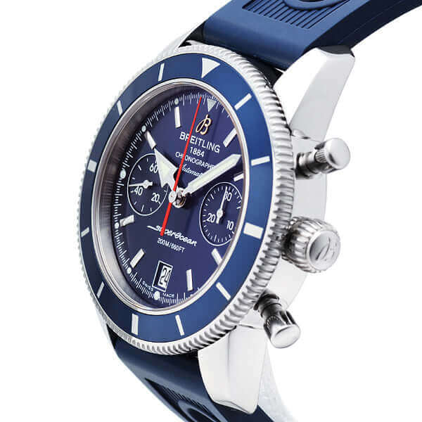 Gehäuse Edelstahl poliert und satiniert, Gehäusedurchmesser 44 mm, Gehäusehöhe 16,2 mm, Edelstahl Lünette mit blauer Einlage und in eine Richtung drehbar mit Sperre, Armband Ocean Racer Kautschuk in Blau mit Faltschließe, Zifferblatt Blau mit aufgesetzten Leuchtindexen, Leuchtzeiger, Uhrwerk Automatik, Chronograph, Chronometer mit Zeugnis, Kaliber Breitling 23 mit 25 Steine, Schwingung 28.800 A/h, Gangreserve für ca. 42 Stunden, Anzeige von Minuten und Sekunde aus der Mitte mit Sekundenstopp zur sekundengenauen Einstellung der Uhrzeit, Datumsanzeige, Saphirglas, doppelseitig entspiegelt und bombiert, verschraubte Krone mit 2 Dichtungen, Edelstahlboden verschraubt, Wasserdicht bis zu 20 bar.