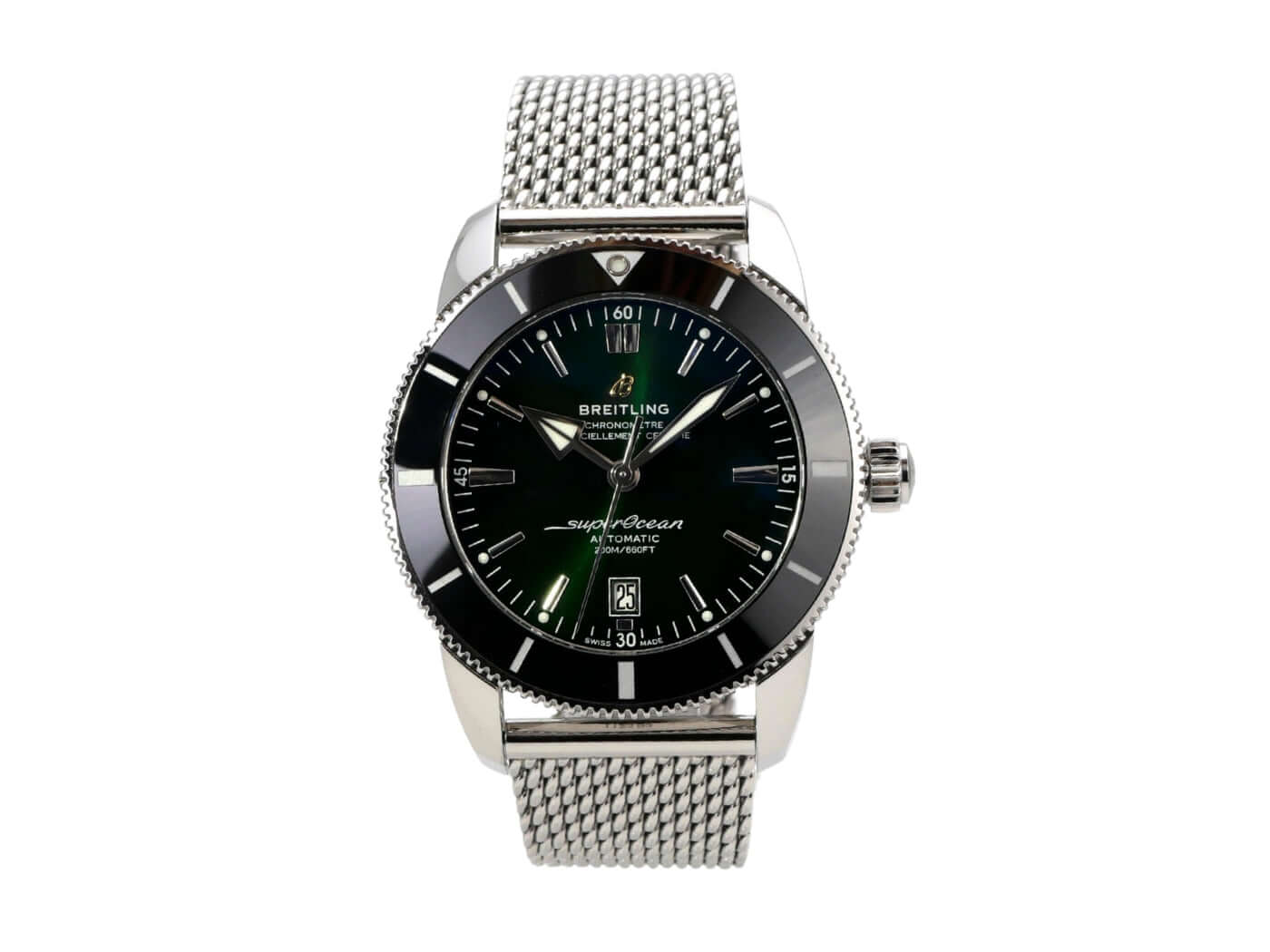 Gehäuse aus Edelstahl poliert und satiniert, Gehäusedurchmesser 46 mm, Gehäusehöhe 15 mm, Edelstahl Lünette mit schwarzer Keramikeinlage, 60 Minuten Skala in eine Richtung drehbar mit Sperre, Ocean Classic Edelstahlband poliert und satiniert mit Faltschließe, grünes Zifferblatt mit aufgesetzten Leuchtindizes, Leuchtzeiger, Automatik, Kaliber Breitling B20 mit 28 Steine, Schwingung 28.800 A/h, Gangreserve für ca. 70 Stunden, Datumsanzeige, Chronometer mit Zeugnis, Saphirglas doppelseitig entspiegelt und bombiert, verschraubte Krone mit Flankenschutz und 2 Dichtungen, Edelstahlboden verschraubt, wasserdicht bis zu 20 bar.