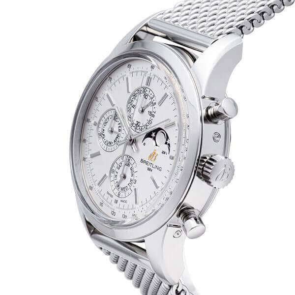 Gehäuse Edelstahl poliert, Gehäusedurchmesser 43 mm, Gehäusehöhe 15,25 mm, Edelstahl Lünette poliert, geflochtenes Edelstahl Armband poliert mit Faltschließe, silberfarbenes Zifferblatt mit aufgesetzten Indexen, Leuchtpunkte, Edelstahl Leuchtzeiger, Automatikwerk Chronograph, Manufakturkaliber Breitling 19 mit 38 Steine, Schwingung 28.800 A/h, Gangreserve für ca. 42 Stunden, Schaltjahr Kalender, Zeigeranzeige (Datum, Wochentag, Monat, Mondphasen), Saphirglas, doppelseitig entspiegelt, Edelstahlboden verschraubt und graviert, Wasserdicht bis zu 5 bar.