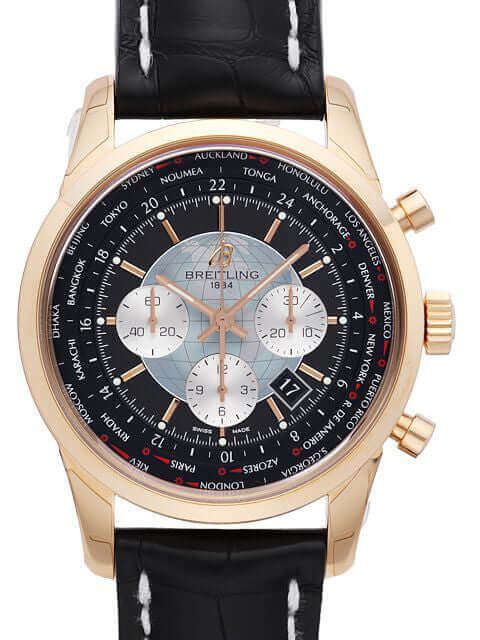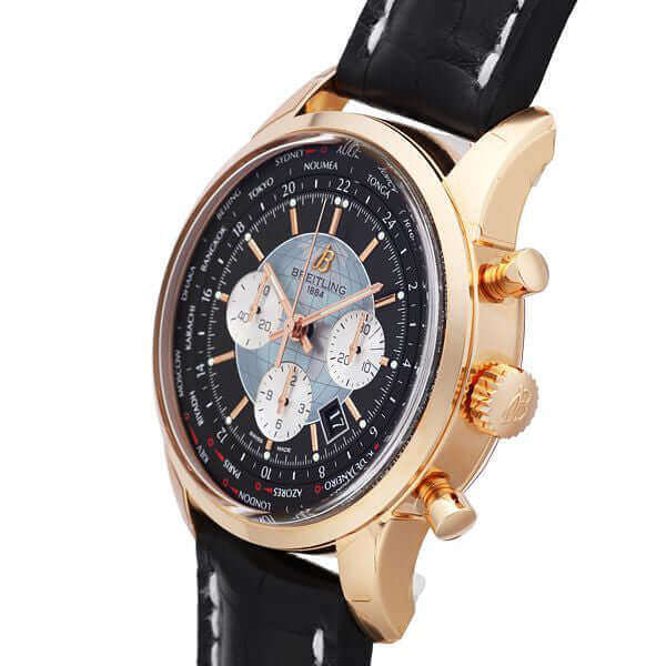 Gehäuse aus 18 kt Rotgold poliert, Durchmesser 46 mm, Höhe 15,40 mm, 18 kt Rotgold Lünette poliert, schwarzes Zifferblatt, schwarzes Krokoleder Armband mit 18 kt Rotgold Faltschließe, Breitling 05 Manufakturkaliber, Automatikaufzug, Schwingung 28.800 A/h, 56 Steine, Gangreserve ca. 70 Stunden, Datumsanzeige, Universal Zeit, beidseitig entspiegeltes Saphirglas, Wasserdicht bis zu 10 bar.