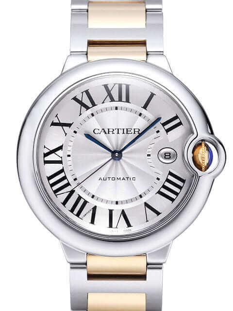 Gehäuse aus Edelstahl poliert, Durchmesser 42 mm, Lünette Edelstahl poliert, Edelstahl / 18 kt Gelbgold Armband poliert und satiniert mit Doppelfaltschließe, Zifferblatt silberfarben mit Zeiger aus gebläutem Stahl, römische Ziffern, Automatikwerk, Kaliber Cartier 049, Saphirglas, Datumsanzeige, verschraubter Boden aus Edelstahl, Wasserdicht bis zu 3 bar.