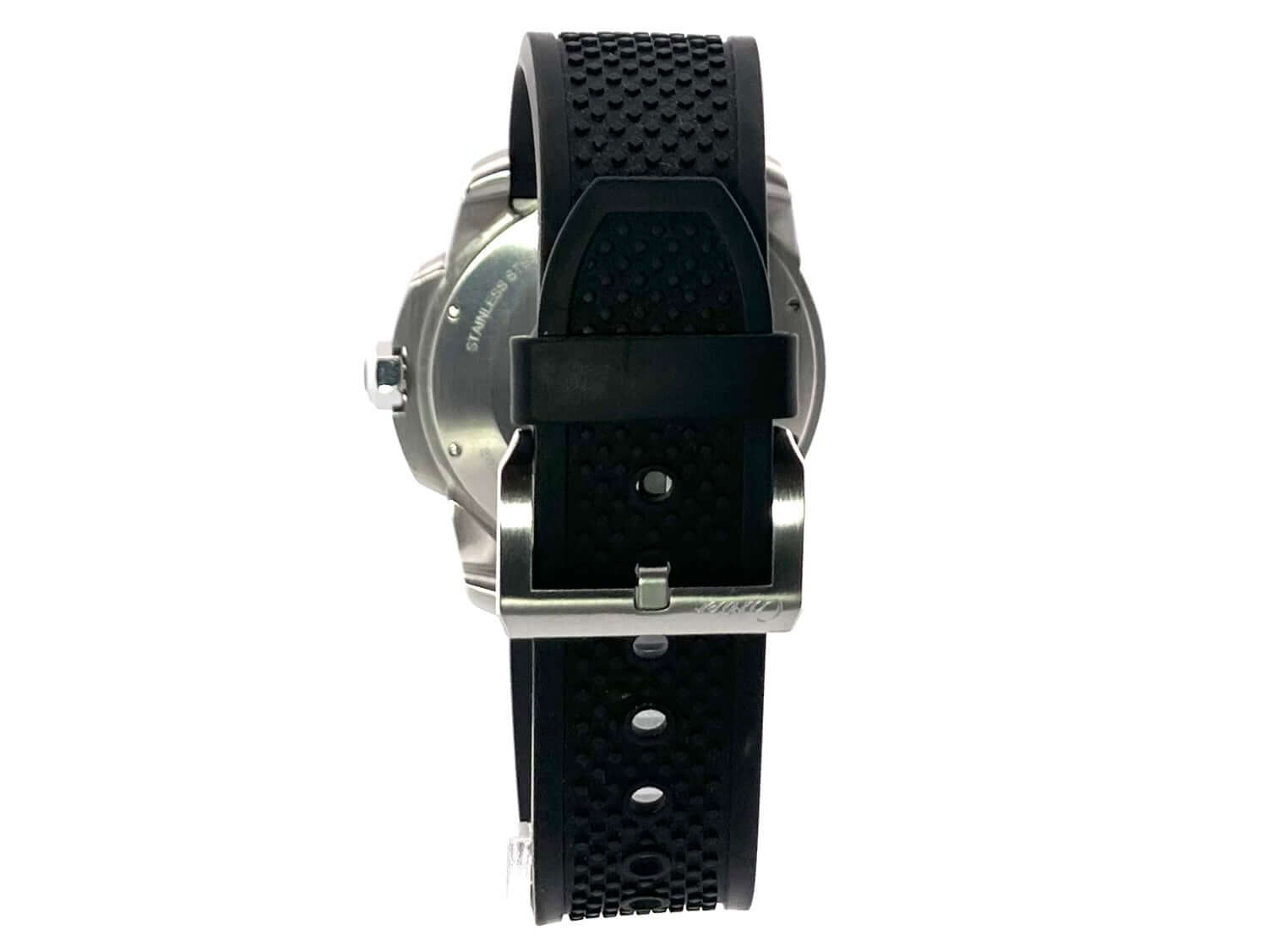 Gehäuse aus Edelstahl poliert und satiniert, Gehäusedurchmesser 42 mm, Gehäusehöhe 11 mm, Edelstahl Lünette mit schwarzer ADLC-Beschichtung und 60 Minuten Skala, einseitig drehbar, Kautschukarmband mit Dornschließe, schwarzes Zifferblatt, kleine Sekunde, Automatikwerk, Cartier Manufakturkaliber 1904 MC, Datumsanzeige bei 3 Uhr, Saphirglas, verschraubte Krone mit Flankenschutz, verschraubter Edelstahlboden, Wasserdicht bis zu 30 bar.