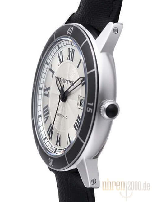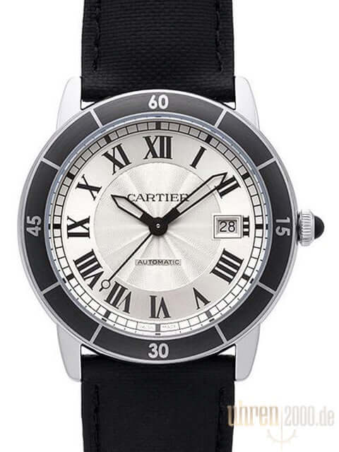 Gehäuse aus Edelstahl poliert, Gehäusedurchmesser 42 mm, Edelstahl Lünette mit schwarzer Einlage, schwarzes Lederarmband mit Faltschließe, Zifferblatt silberfarben, römische Ziffern, Automatikwerk, Kaliber Cartier 1847 MC, Saphirglas, Datumsanzeige, verschraubter Boden aus Edelstahl, Wasserdicht bis zu 3 bar.