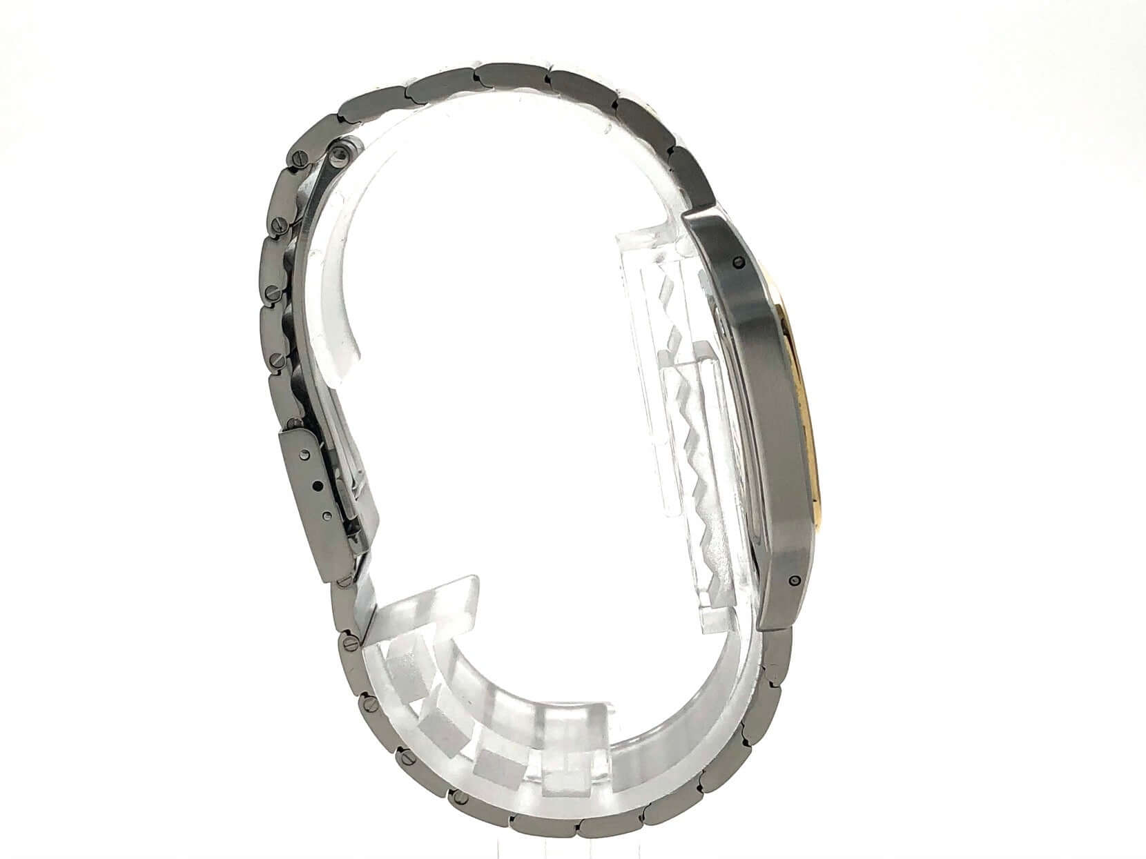 Gehäuse aus Edelstahl poliert und satiniert, Länge 41 mm x Breite 29 mm, Gehäusehöhe 8,5 mm, Lünette 18 kt Gelbgold poliert, Edelstahl Armband satiniert mit polierten Schrauben aus 18 kt Gelbgold, Doppelfaltschließe, silberfarbenes Zifferblatt, Quarz, Datum, Krone mit Flankenschutz, Saphirglas, Boden aus Edelstahl, Wasserdicht bis zu 3 bar.