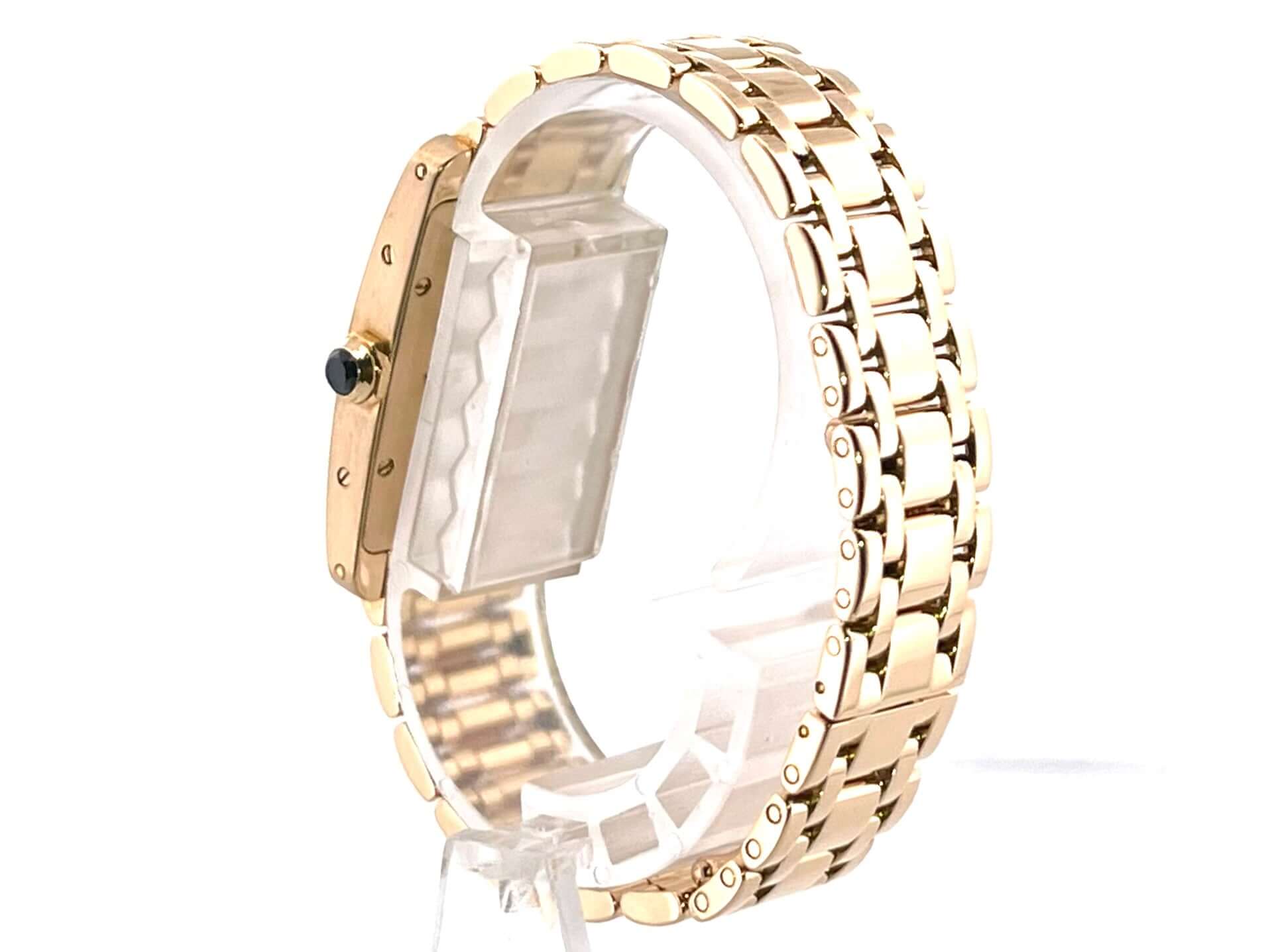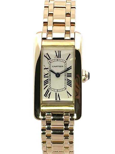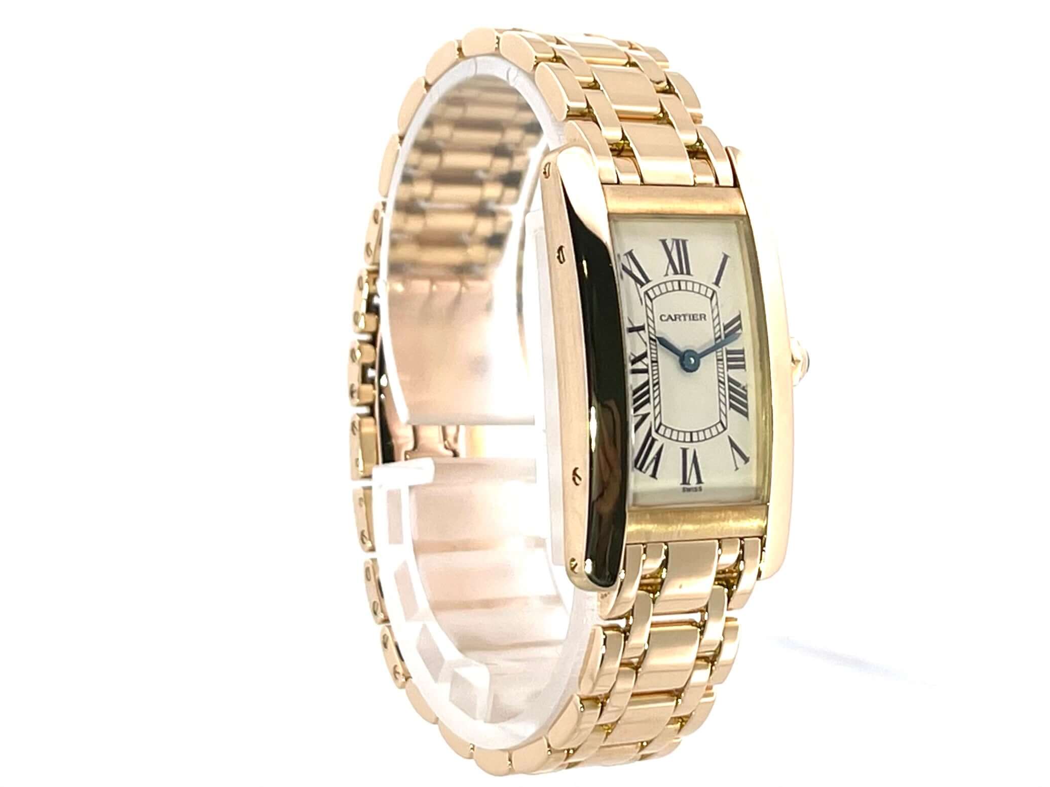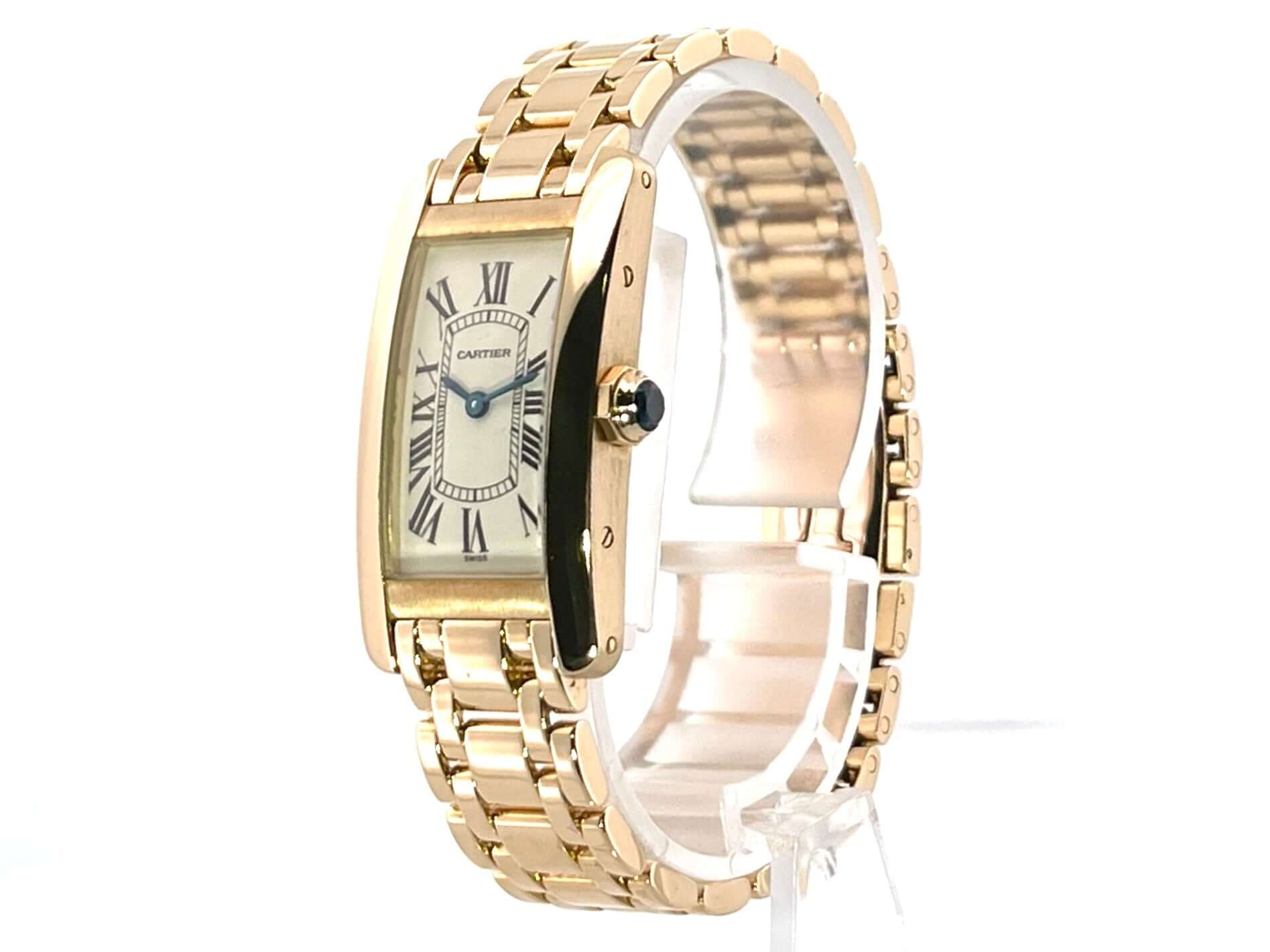 Gehäuse aus 18 kt Gelbgold poliert und satiniert, ca. 35 mm x 19 mm, 18 kt Gelbgold Armband mit Faltschließe, Zifferblatt silberfarben mit Zeiger aus gebläutem Stahl, römische Ziffern, Quarz, wasserdicht bis zu 3 bar.