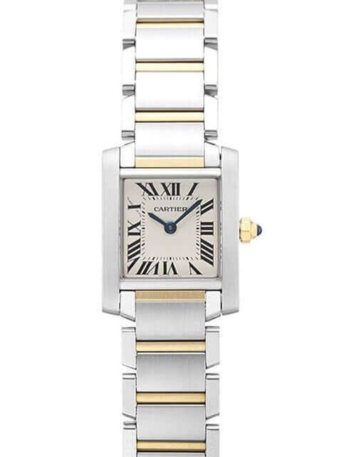 Gehäuse aus Edelstahl, Gehäusedurchmesser 25 mm x 20 mm, Höhe 6,15 mm, Edelstahl / Gold Armband mit Faltschließe, silberfarbenes Zifferblatt mit Zeiger aus gebläutem Stahl, römische Ziffern, Quarz, Kaliber Cartier, Gelbgold Krone, Wasserdicht bis zu 3 bar.