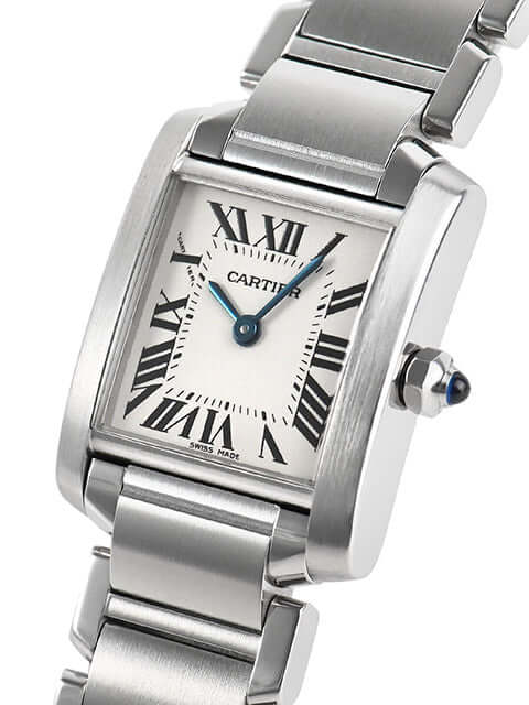 Gehäuse aus Edelstahl, Gehäusedurchmesser 25 mm x 20 mm, Höhe 6,15 mm, Edelstahl Armband mit Faltschließe, silberfarbenes Zifferblatt mit Zeiger aus gebläutem Stahl, römische Ziffern, Quarz, Kaliber Cartier, Wasserdicht bis zu 3 bar.