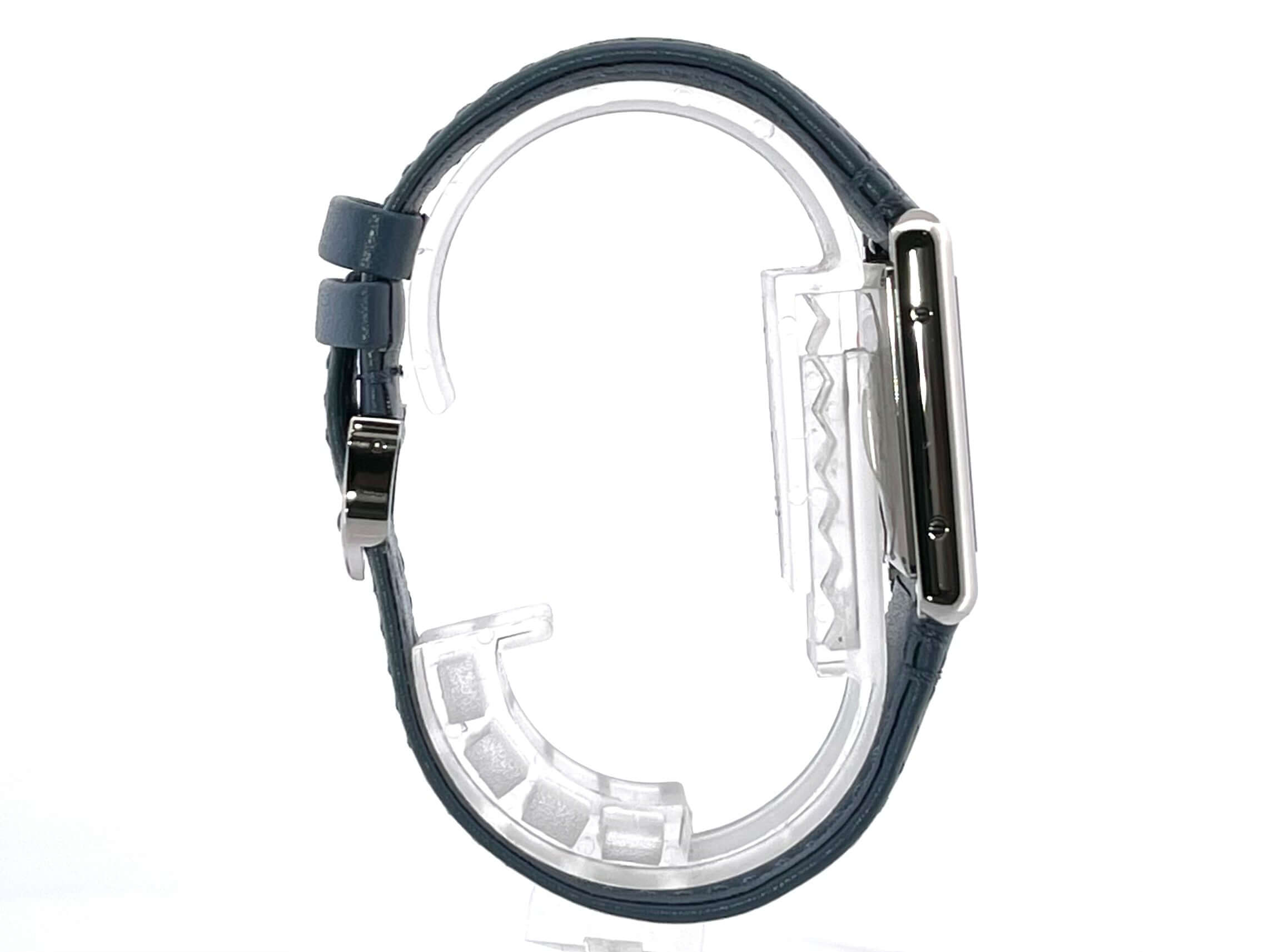 Gehäuse aus Edelstahl poliert, Länge 33,7 mm x Breite 25,5 mm, Gehäusehöhe 6,6 mm, Lünette Edelstahl poliert, veganes blaues Armband mit Dornschließe, silberfarbenes Zifferblatt mit Zeiger aus gebläutem Stahl, Quarz, Photovoltaik-Uhrwerk, Datum, Saphirglas, Boden aus Edelstahl, wasserdicht bis zu 3 bar.