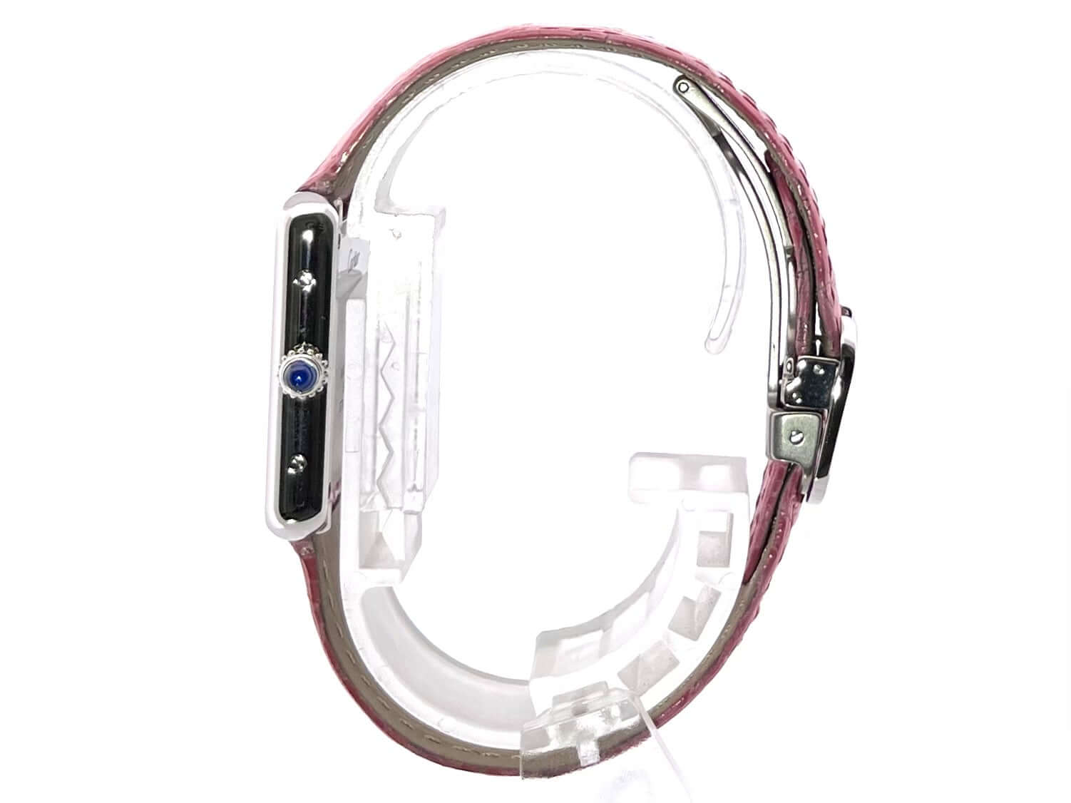 Gehäuse aus Edelstahl poliert und satiniert, Länge 31 mm x Breite 24,4 mm, Gehäusehöhe 5,55 mm, Edelstahl Lünette satiniert, pinkfarbenes Lederband mit Faltschließe, pinkfarbenes Zifferblatt mit Zeiger aus gebläutem Stahl, Quarzwerk, Saphirglas, verschraubter Boden aus Edelstahl, Wasserdicht bis zu 3 bar.