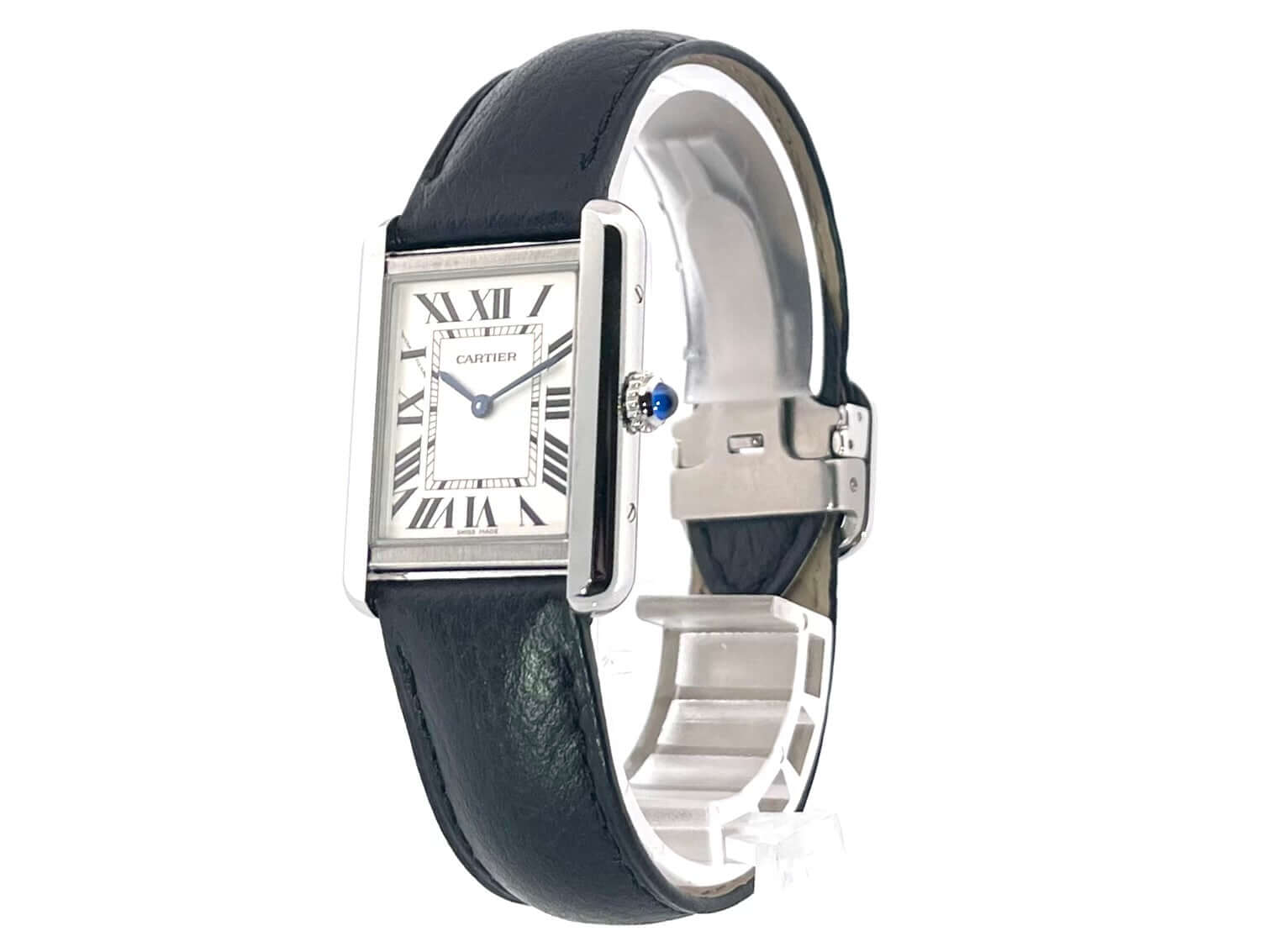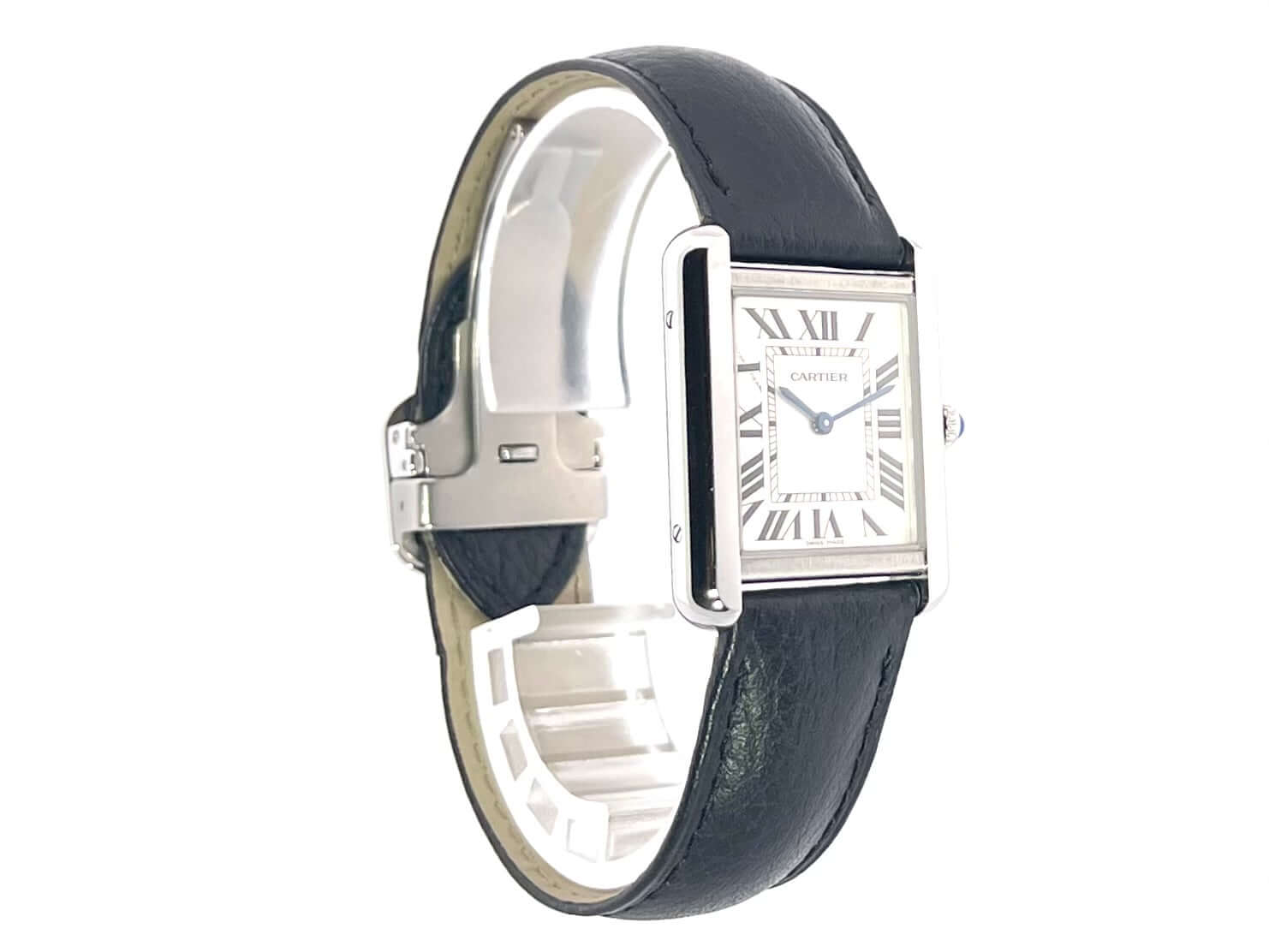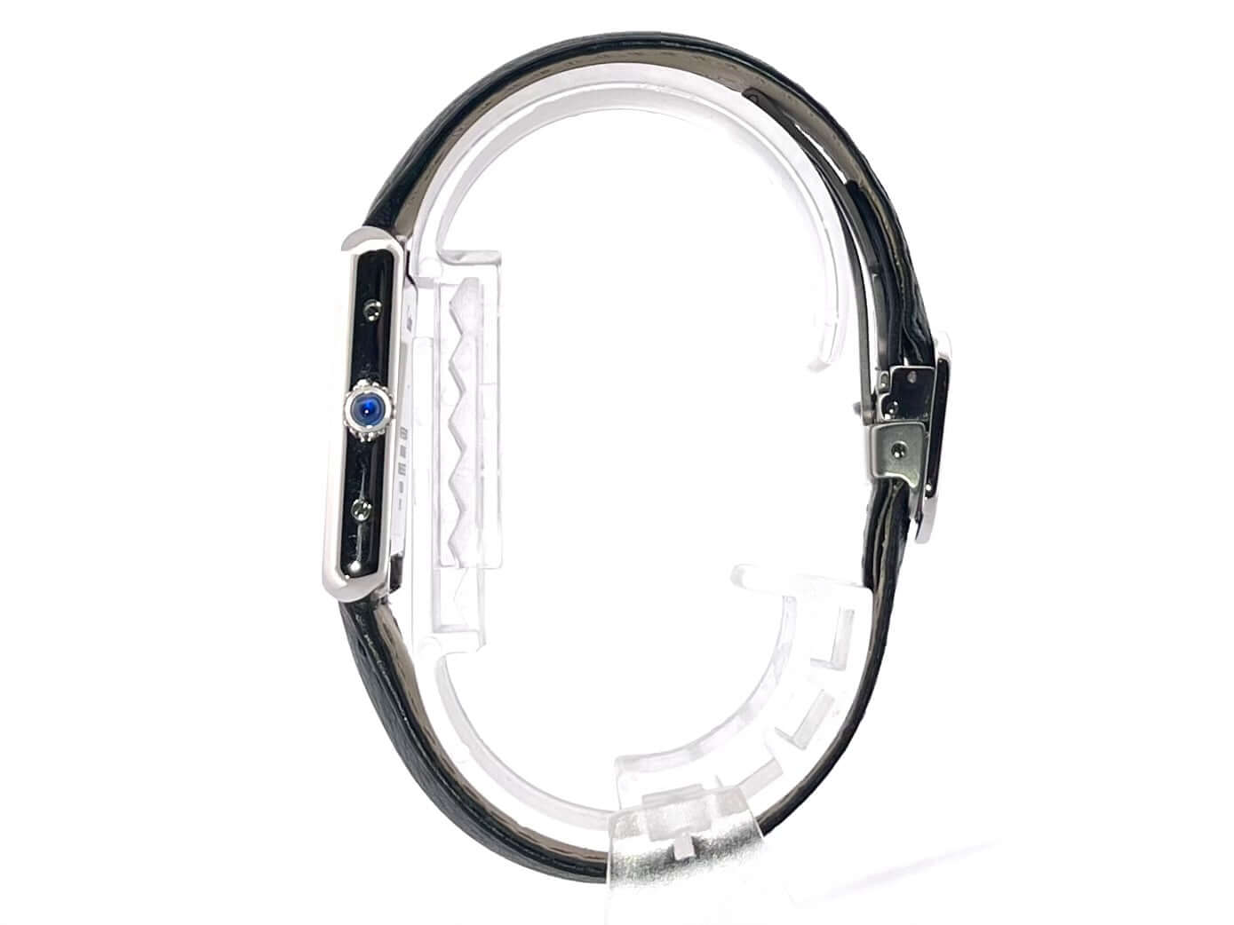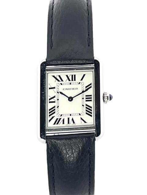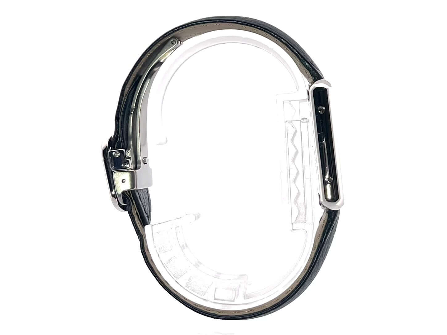 Gehäuse aus Edelstahl poliert und satiniert, Länge 31 mm x Breite 24,4 mm, Gehäusehöhe 5,55 mm, Edelstahl Lünette satiniert, schwarzes Lederband mit Dornschließe, silberfarbenes Zifferblatt mit Zeiger aus gebläutem Stahl, Quarzwerk, Saphirglas, verschraubter Boden aus Edelstahl, Wasserdicht bis zu 3 bar.