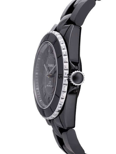 Gehäuse aus schwarzem Hightech-Keramik, Gehäusedurchmesser 38 mm, Edelstahl Lünette mit schwarzer Keramik einseitig drehbar mit Sperre, schwarzes Hightech-Keramikband mit Faltschließe aus Edelstahl, schwarz Lackiertes Zifferblatt, Automatik, Chanel J12.1, Gangreserve ca. 70 Stunden, Chronometer, Saphirglas, Krone verschraubbar mit Flankenschutz, Sichtboden, Wasserdicht bis zu 20 bar.