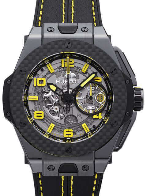 Gehäuse aus Keramik, Gehäusedurchmesser 45 mm, Lünette aus Carbon, transparentes Zifferblatt mit gelben arabischen Ziffern, schwarzes Kautschuk / Leder mit gelber Ziernaht und Faltschließe, Automatikwerk, Manufakturkaliber HUB1241 mit 38 Steine, Schwingung 28.800 A/h, Gangreserve für ca. 72 Stunden, Datumsanzeige, Saphirglas entspiegelt, Saphirglasboden verschraubt, Wasserdicht bis 10 bar, Limitiert auf 1.000 Stück.