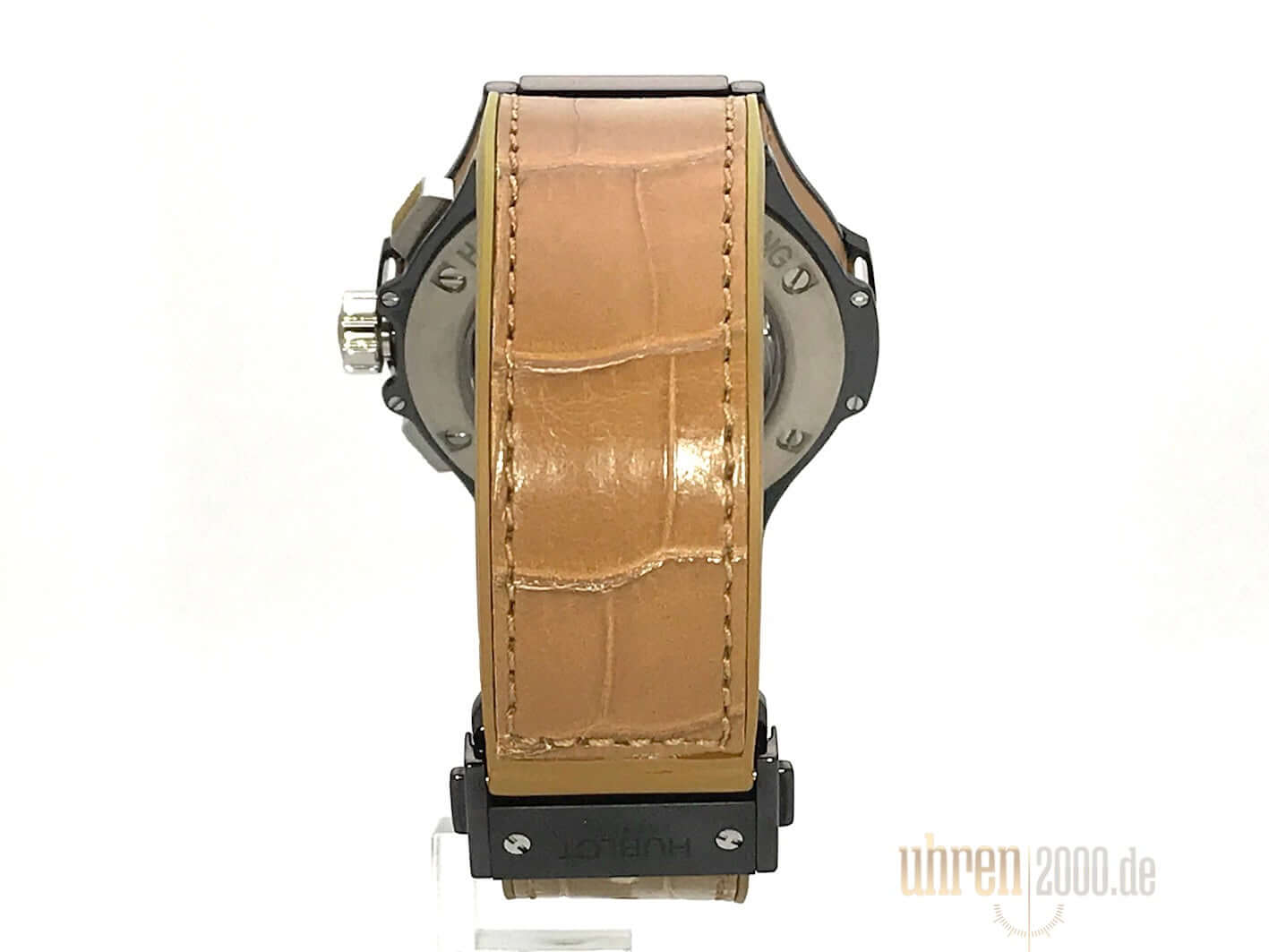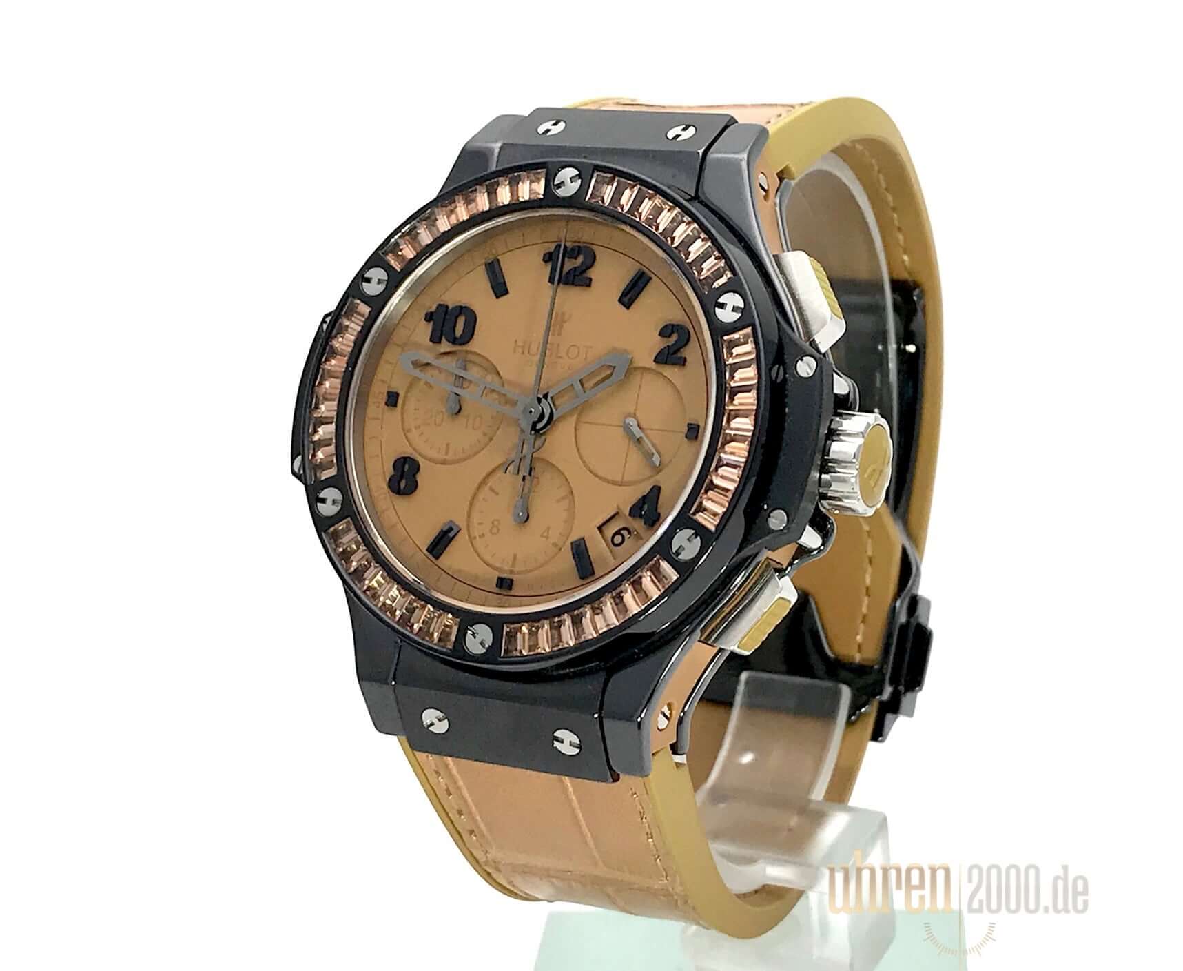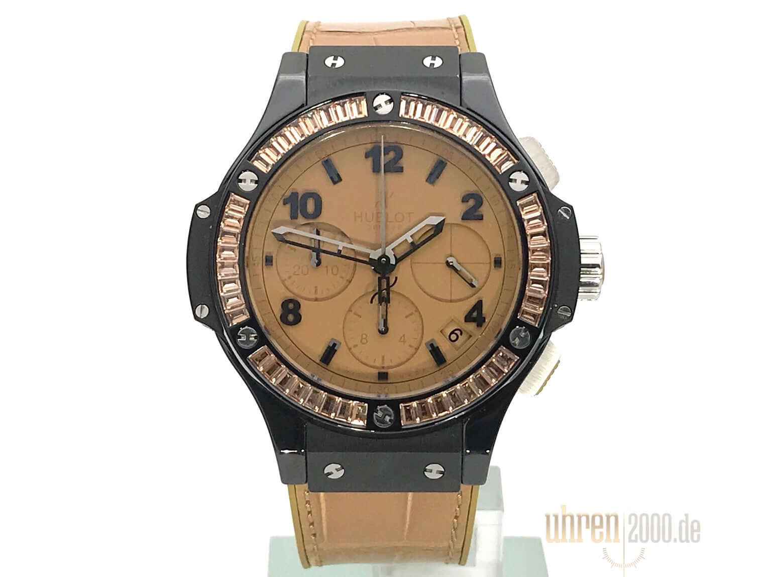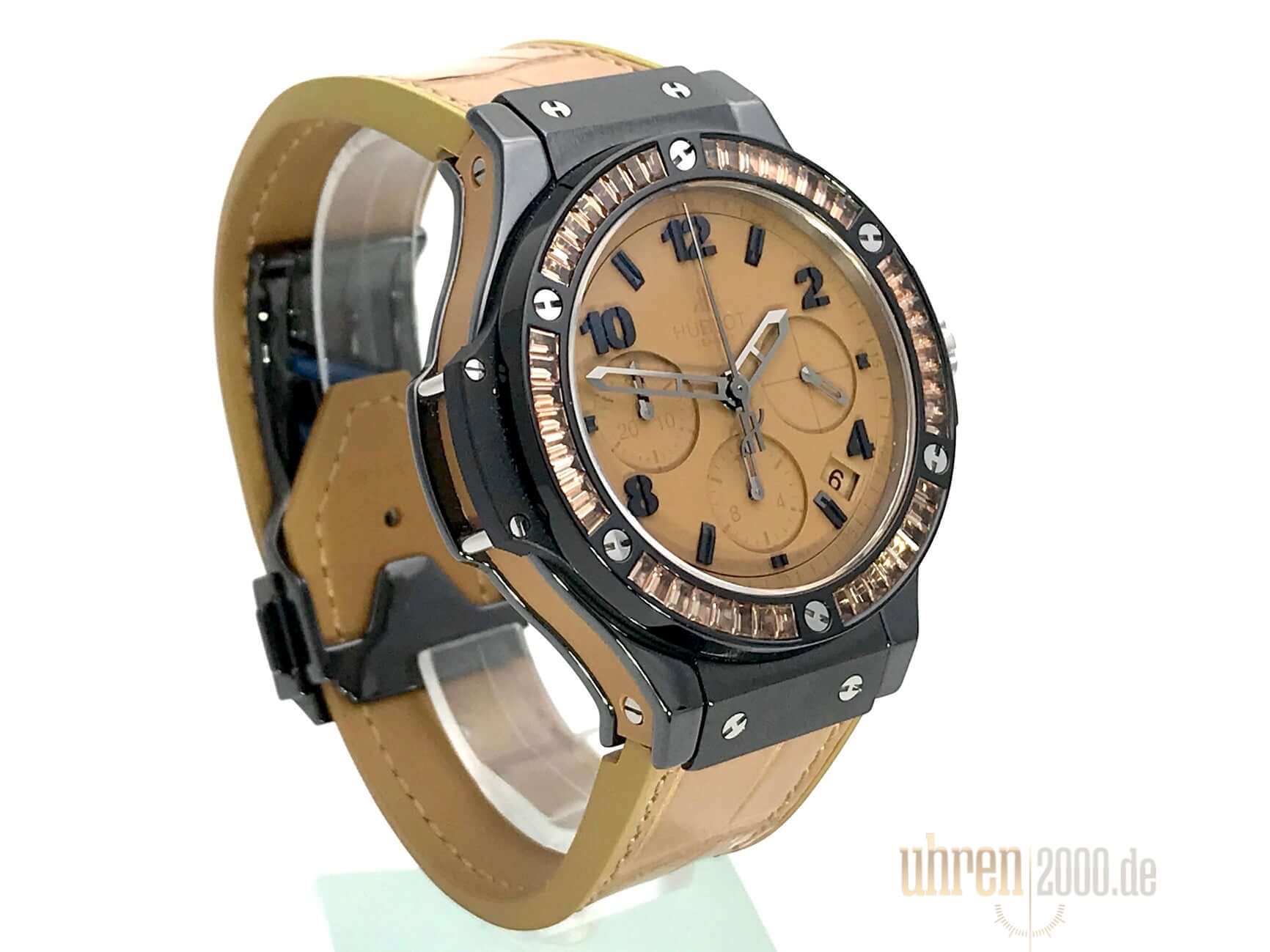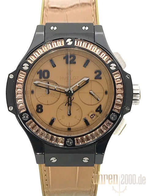 Gehäuse aus Keramik, Gehäusedurchmesser 41 mm, Keramik Lünette mit 36 Diamanten besetzt, braunes Zifferblatt mit arabischen Ziffern, braunes Kautschuk / Krokolederband mit Faltschließe, Automatikwerk, Manufakturkaliber HUB4300, Schwingung 28.800 A/h, Gangreserve für ca. 42 Stunden, Datumsanzeige, Saphirglas entspiegelt, Saphirglasboden verschraubt, Wasserdicht bis zu 10 bar.