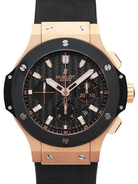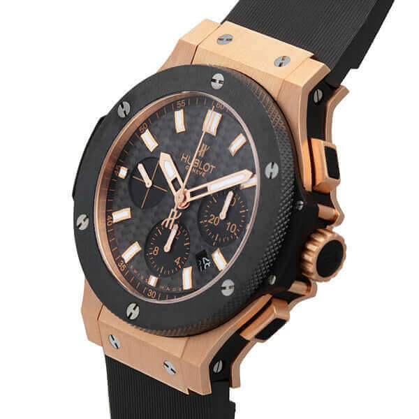 Gehäuse aus Keramik und satiniertem 18 kt Rotgold, Gehäusedurchmesser 44 mm, Gehäusehöhe 14,50 mm, Keramik und 18 kt Rotgold Lünette, Zifferblatt Carbon mit weißen Leuchtindexen in Rotgold eingefasst und Rotgold Zeiger, schwarzes Kautschuk Armband mit Faltschließe aus 18 kt Rotgold, Automatikwerk, Manufakturkaliber HUB4100 mit 27 Steine, Schwingung 28.800 A/h, Gangreserve für ca. 42 Stunden, Datumsanzeige, Saphirglas entspiegelt, Saphirglasboden verschraubt, Wasserdicht bis 10 bar.