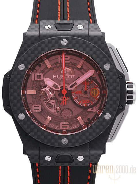 Gehäuse aus Carbon, Gehäusedurchmesser 45 mm, Lünette aus Carbon, transparentes Zifferblatt mit arabischen Ziffern, schwarzes Kautschuk / Leder mit roter Ziernaht und Faltschließe, Automatikwerk, Manufakturkaliber HUB1241 mit 38 Steine, Schwingung 28.800 A/h, Gangreserve für ca. 72 Stunden, Datumsanzeige, Saphirglas entspiegelt, Saphirglasboden verschraubt, Wasserdicht bis 10 bar, limitiert auf 1.000 Stück.