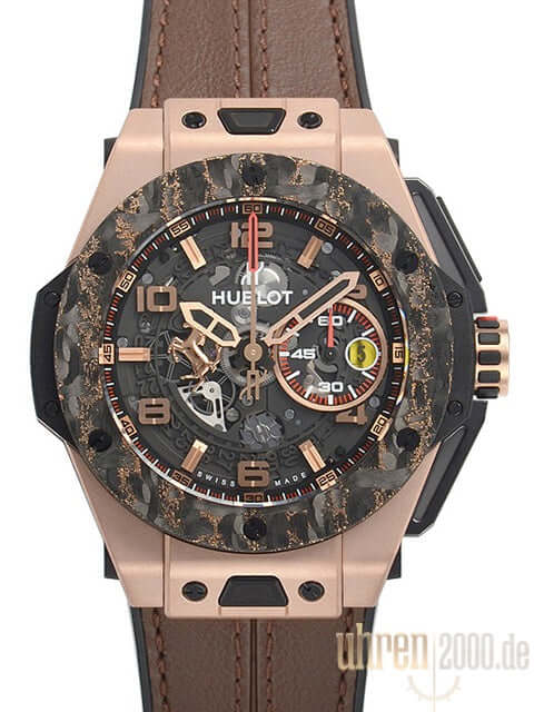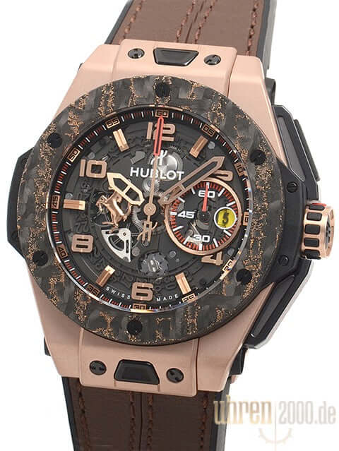 Gehäuse aus Rotgold, Gehäusedurchmesser 45 mm, Lünette aus Carbon, transparentes Zifferblatt mit arabischen Ziffern, schwarzes Kautschuk / braunes Leder mit Ziernaht und Faltschließe, Automatikwerk, Manufakturkaliber HUB1241 mit 38 Steine, Schwingung 28.800 A/h, Gangreserve für ca. 72 Stunden, Datumsanzeige, Saphirglas entspiegelt, Saphirglasboden verschraubt, Wasserdicht bis 10 bar, Limitiert auf 500 Stück.