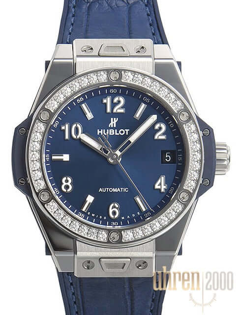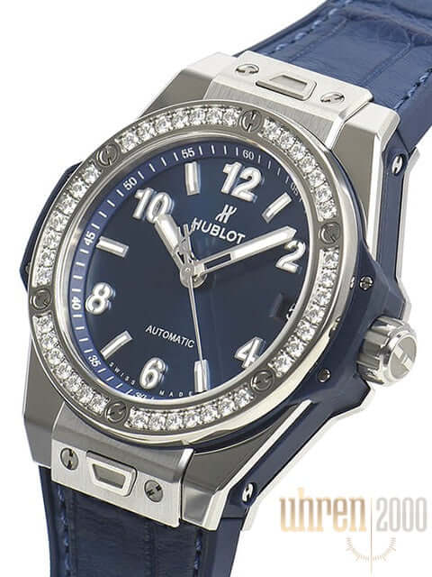 Gehäuse aus Edelstahl poliert und satiniert, Gehäusedurchmesser 39 mm, Edelstahl Lünette mit 42 Diamanten, blaues Zifferblatt, blaues Kautschukarmband mit Alligatorlederinlay und Faltschließe, Automatikwerk, Kaliber HUB1710, Gangreserve für ca. 50 Stunden, Saphirglas entspiegelt, Saphirglasboden verschraubt und graviert, Wasserdicht bis 10 bar.